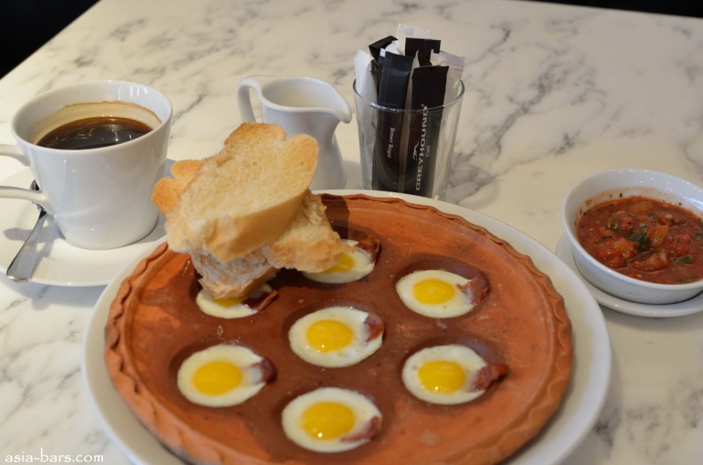 Breakfast- Bacon and Egg in the Hole– Bacon bits with egg cooked in Thai hot tray served with baguette and coffee or tea