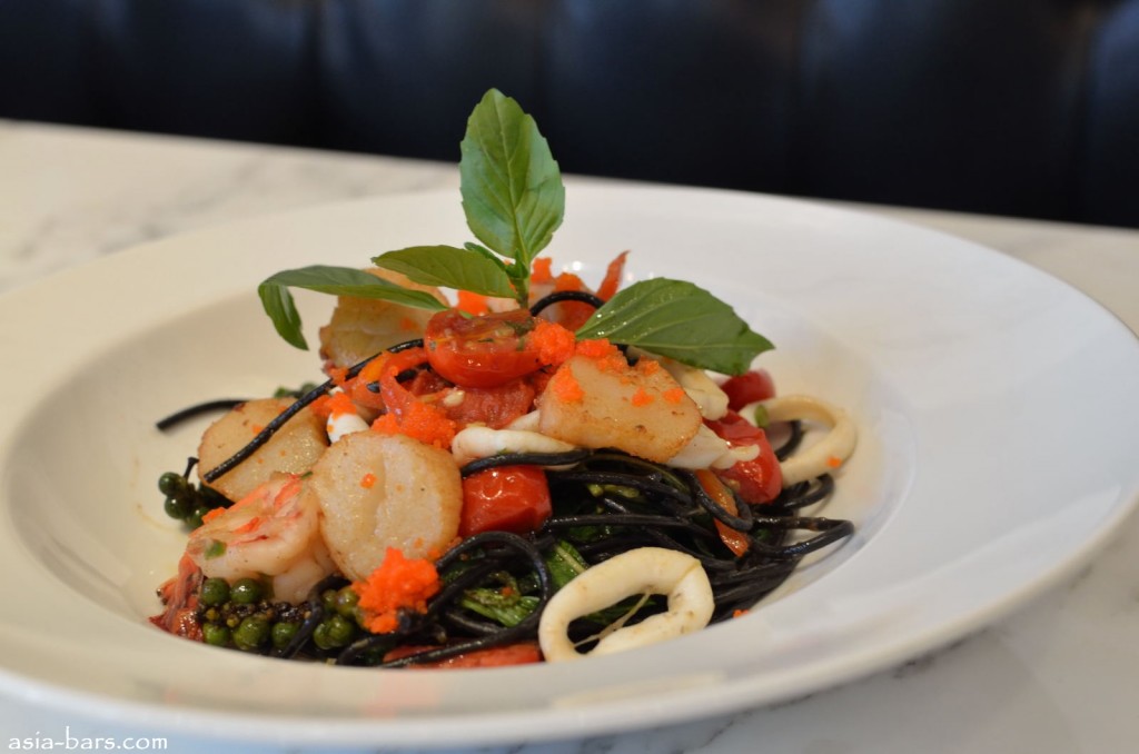 Spaghetti Cha Cha Cha- Ink spaghetti with tiger prawn and scallops stir-fried with Italian basil leaves, green peppercorns and chilies