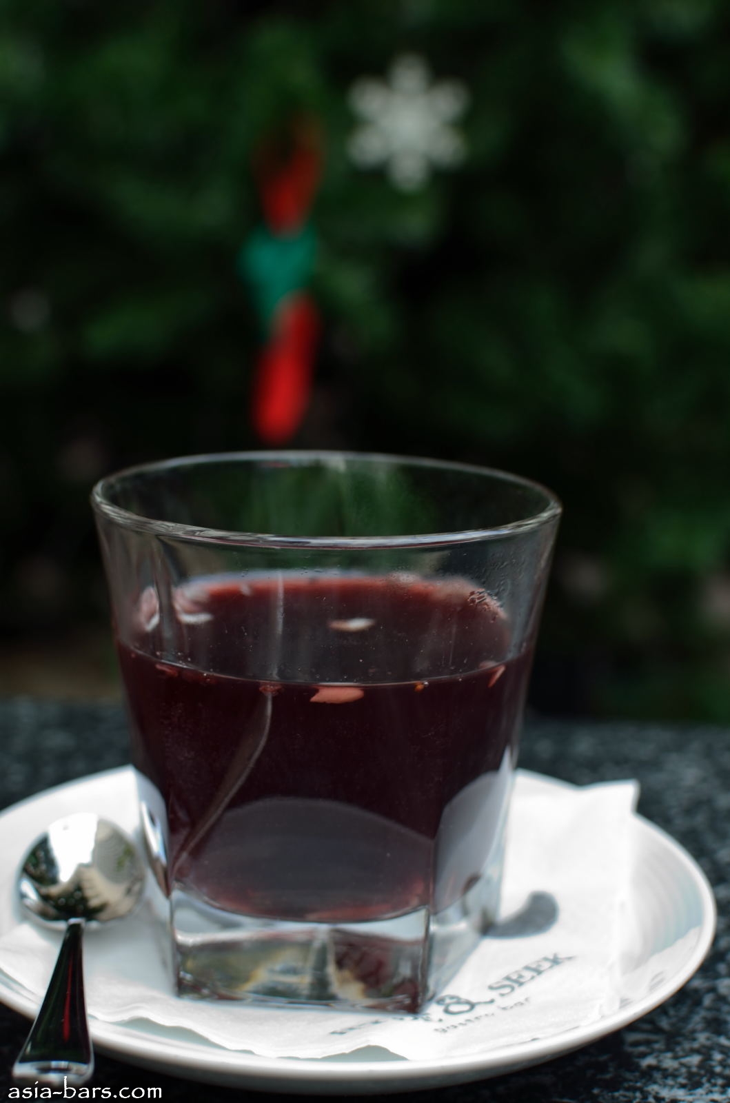 Glögg – red wine, brandy, clove, cinnamon stick, green cardamom, star anise- served warm with almond slice & raisin