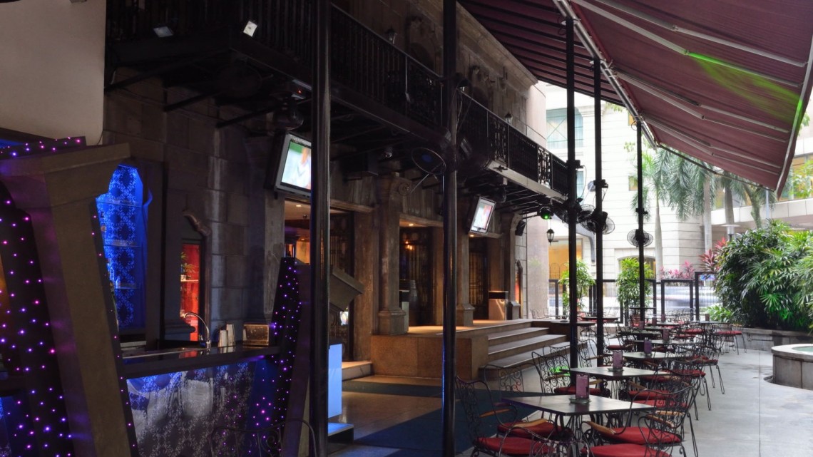 The Island Bar on the lower level features the large centre-piece square shaped bar- with counter seating on three sides, and along two of the walls, timber paneled alcoves with deep leather booth seating. A dance floor and stage area are at one end of the room, and large open doorways lead to the adjacent outdoor terrace. Apart from serving all the regular bar staples such as draft beer, premium spirits, wines etc, the bar specialties are Cuban themed cocktails- using premium Cuban rums and sugar can spirits. The extensive selections of Mojitos, Caipirinhas and Margaritas provide many popular choices.