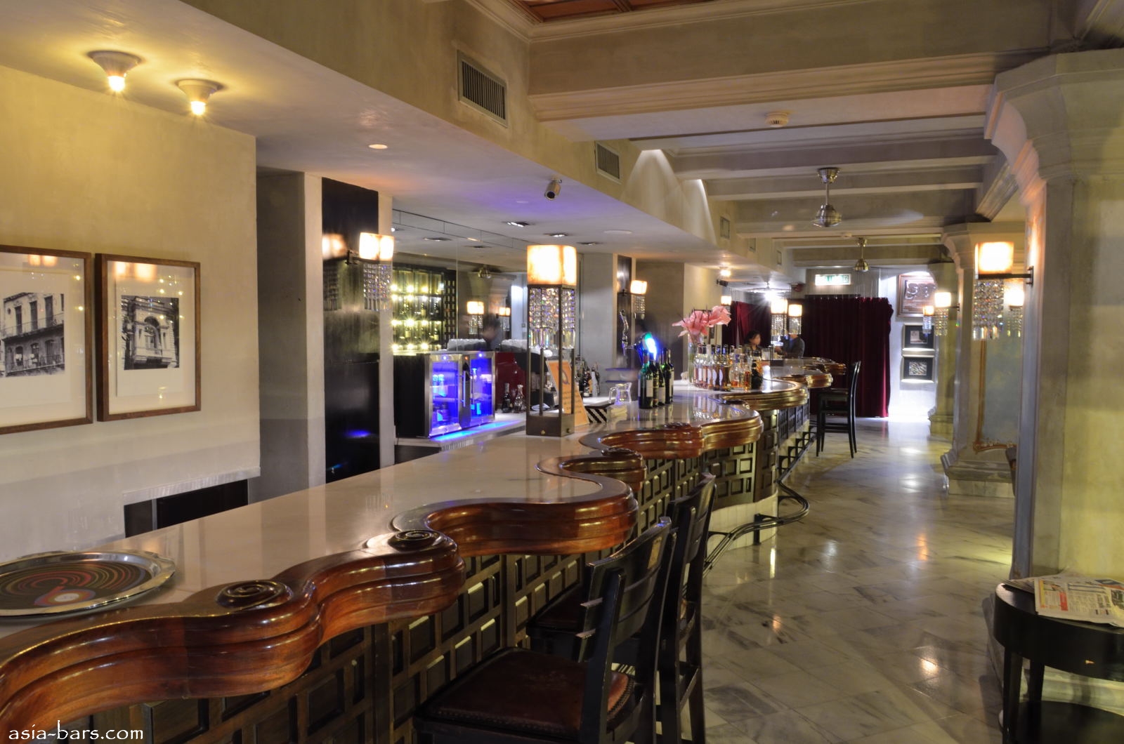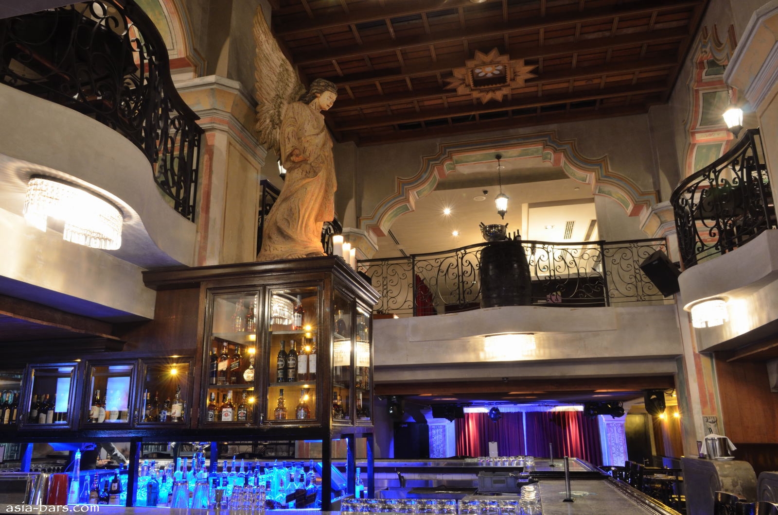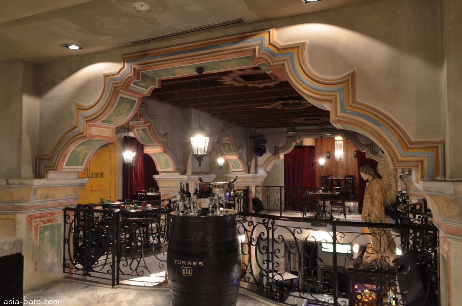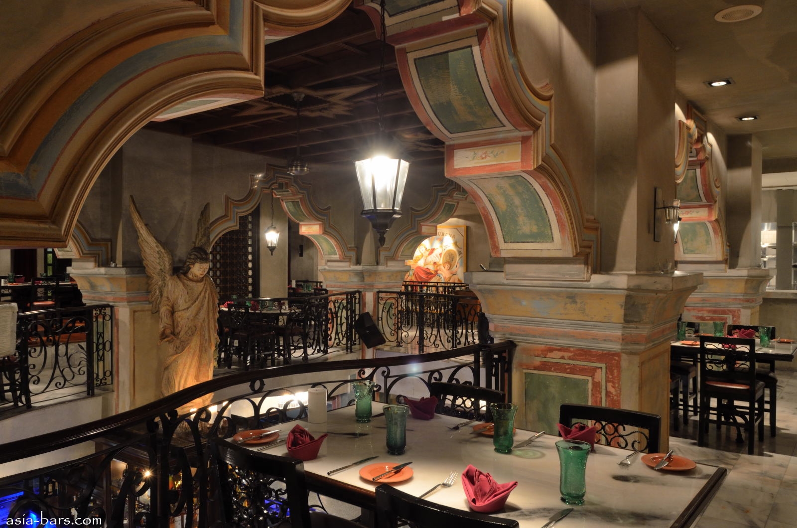 The design concept for Qba Latin Bar & Grill was created by leading Singapore design firm Poole & Associates. The principal of the firm, Ed Poole, spent one month travelling within Cuba to absorb the cultural and architectural heritage to ensure an authentic representation for the Qba project. The dominant colonial influence in Cuba was the centuries long Spanish occupation- resplendent with their grand colonial buildings. The equally important influence of the Catholic church and it’s elaborate baroque style of the period has also been captured in elements of the design of Qba. The result is an impressive venue spread over two levels with an open double-volume space soaring above the island bar. The style is both graceful and relaxed- with the atmosphere of colonial era grandeur. Elaborate ornamentation is featured throughout, with chandeliers, wrought iron balustrades, hand painted frescoes, and grand arches. Authentic materials utilised include extensive white marble, dark timbers, and wrought iron work. Distressed paintwork finishes on archway trims and walls were hand-painted by a specialist artist. The focal piece of the main room is the life-sized angel- hand carved from a single solid tree trunk. Gazing down from above the island bar, the angel castes a serene omnipresence over both the bar and the upper level “paladar’ style dining room.