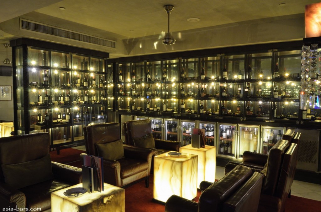 The Wine Bar is located on the upper level- and is accessed either from an entrance at the Lower Lobby Level – or via the broad staircase connecting the Island Bar on the lower level, with the upper level dining room. The Wine Bar features a full length bar counter running down one side, with elaborate curved timber edging. Dark timber bar stools line the counter. Opposite the long bar counter are a series of luxurious lounge areas- with plush brown leather arm chairs, and with lighted onyx tables providing a soft yellow glow. Glass cabinets display the extensive wine selections available, and also serve as dividing walls between the lounge areas. Located at the end of the room adjacent to the dining room , is the cigar room, featuring an outdoor balcony. Naturally, Cuban cigars are available for purchase. A large variety of wines from South America and Spain are featured in the cellars.