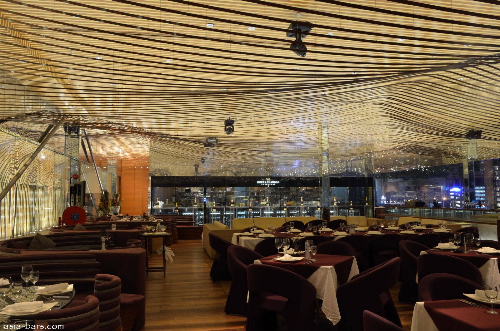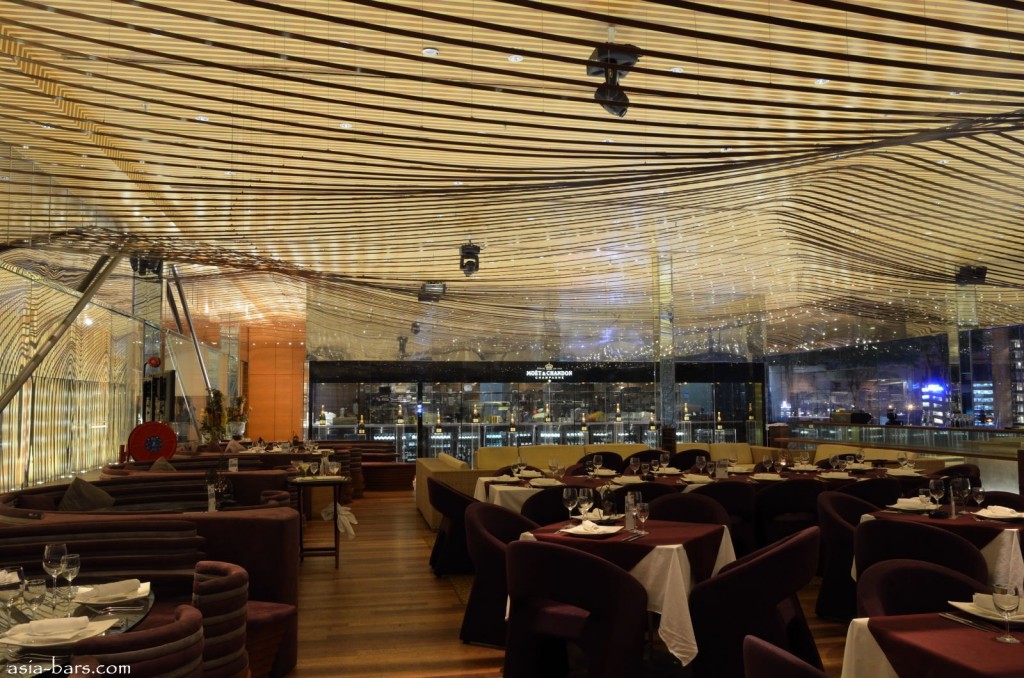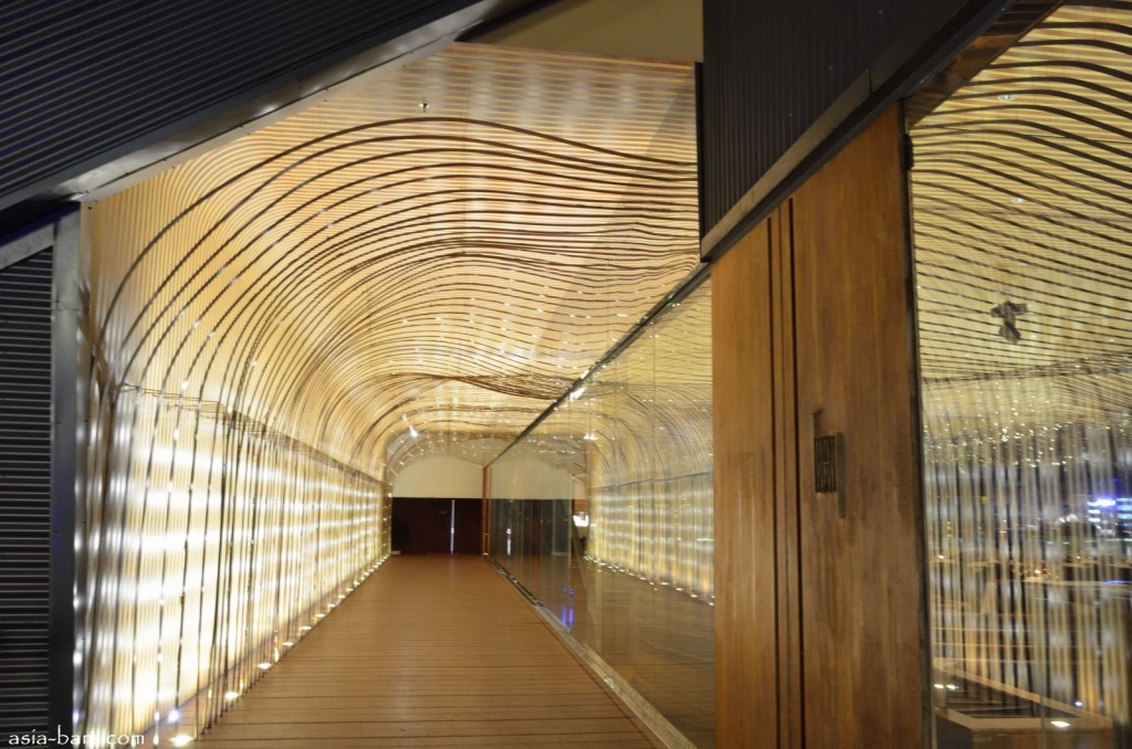 Back in 2009 the owners of the iconic LOT 10 shopping mall in central Kuala Lumpur re-developed the concrete rooftop carpark into the “Forest in the City“. Creating a green oasis on the rooftop of the mall, the manicured grass lawn is enclosed on three sides by low rise buildings that are covered with masses of green foliage. The rooftop is now home to an upscale fitness centre, The Actors Studio, the mega dance club ROOTZ and it’s related brasserie Teeq. Both ROOTZ and Teeq are operated by the same food and beverage group behind their famous Bukit Bintang neighbour- the FEAST Village and Shook! at the Starhill Gallery. The concept for Teeq was conceived as contemporary brasserie style dining, with combinations of modern European and Asian- particularly Japanese- cuisines. The name of Teeq originates from the pronunciation of “teak”- and evokes the predominant use of teak timbers in the interior design. The design highlight is the flowing waves of teak wood “ribs” in patterns across the ceiling of the entire large room.