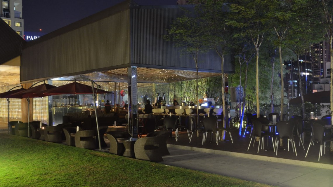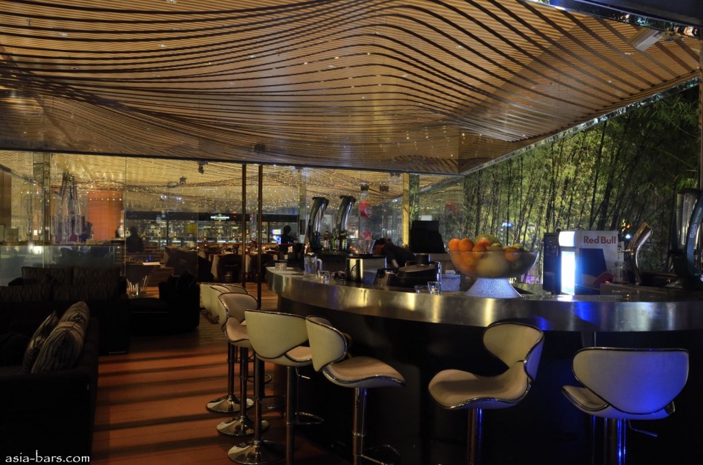Overhead the curved, undulating teak ribbed ceiling continues the design theme of the interior. Extending along a further timber decked section are casual tables and chairs, set amongst a stand of slender trees, and totally in the outdoor environment. Here guests can chill out whilst taking in the views across the manicured central lawn towards the other rooftop buildings covered in the lush tropical greenery, and to the KL skyline beyond.