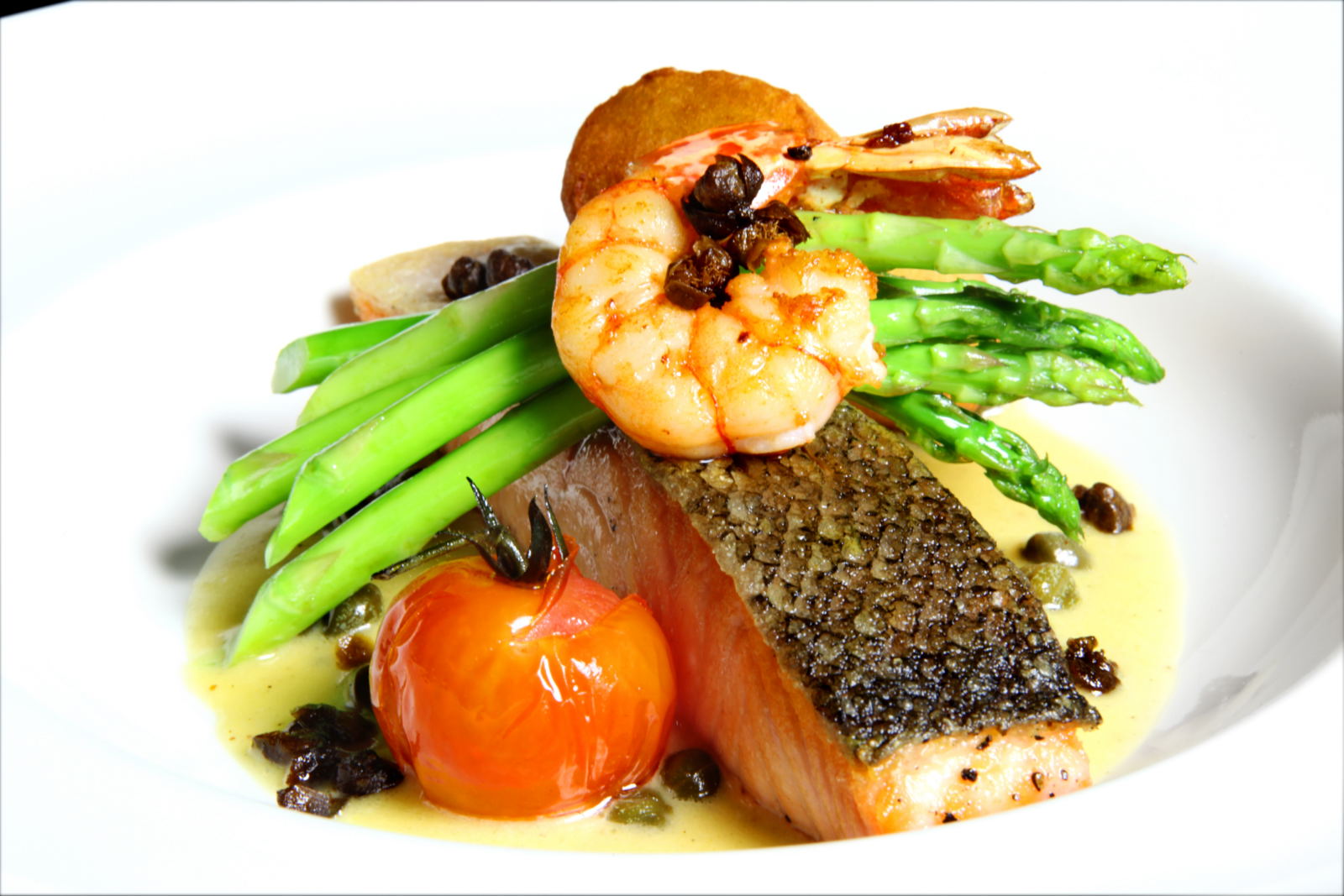 Pan Fried Salmon– served on a potato croquette, tomato, asparagus & caper butter sauce