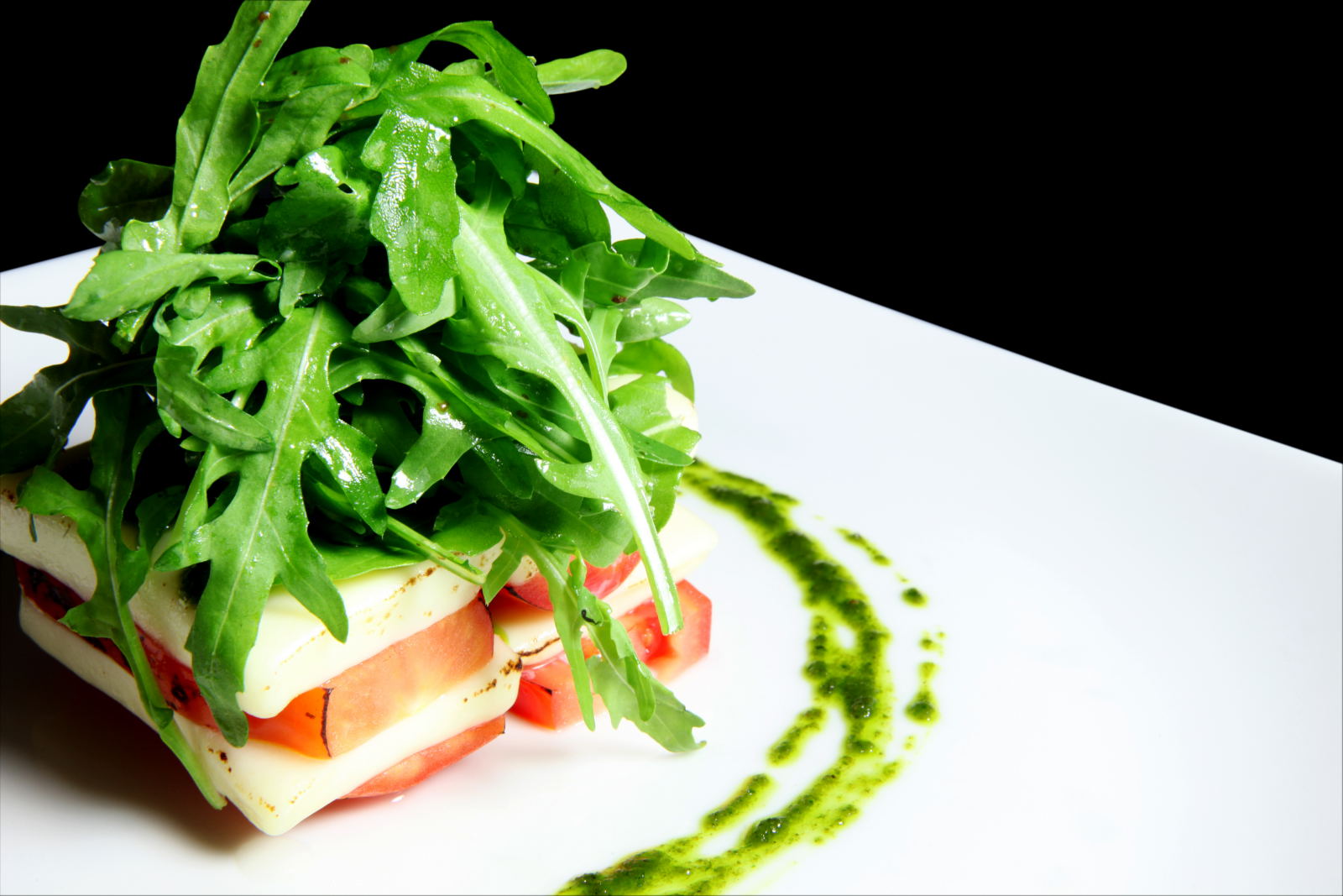 Marinated Roma Tomatoes– with sliced buffalo mozzarella, rocket & basil pesto
