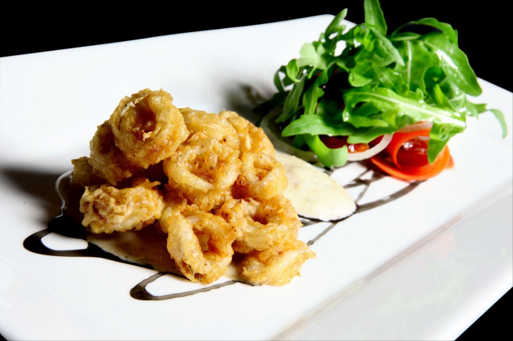 Baby Squid Tempura– with red onion, cherry tomato, carrot, garlic aioli, smoked mussel and squid ink reduction