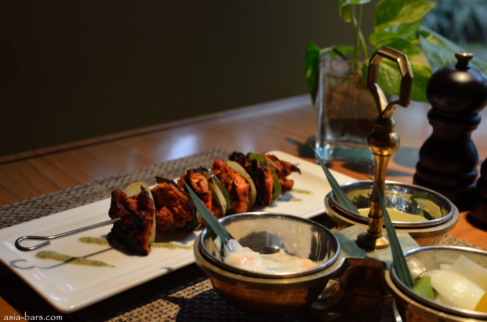 Chicken Tikka- chicken marinated with Indian spices and yoghurt, accompanied by mint sauce and cucumber raita