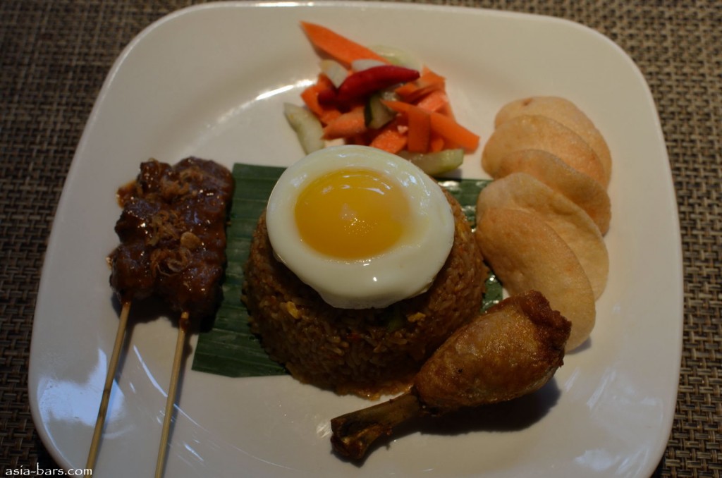 NASI GORENG– wok fried rice with egg, carrot, cabbage, caisim, sambal sauce, accompanied with crispy prawn crackers, acar pickles, deep fried chicken drumlet,beef satay and sunny side up fried egg