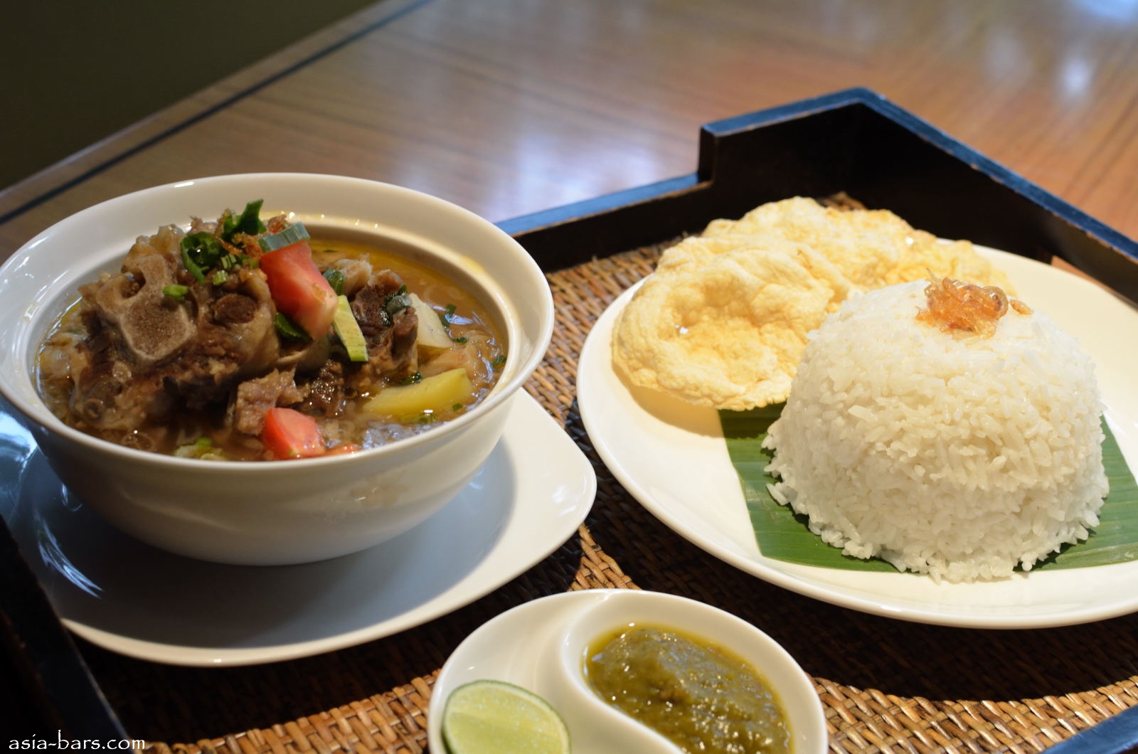 INDONESIAN STYLE OXTAIL SOUP– simmered oxtail with potatoes, carrots, leeks and fried shallot- accompanied with green chili sambal, steamed rice and bitter nut crackers