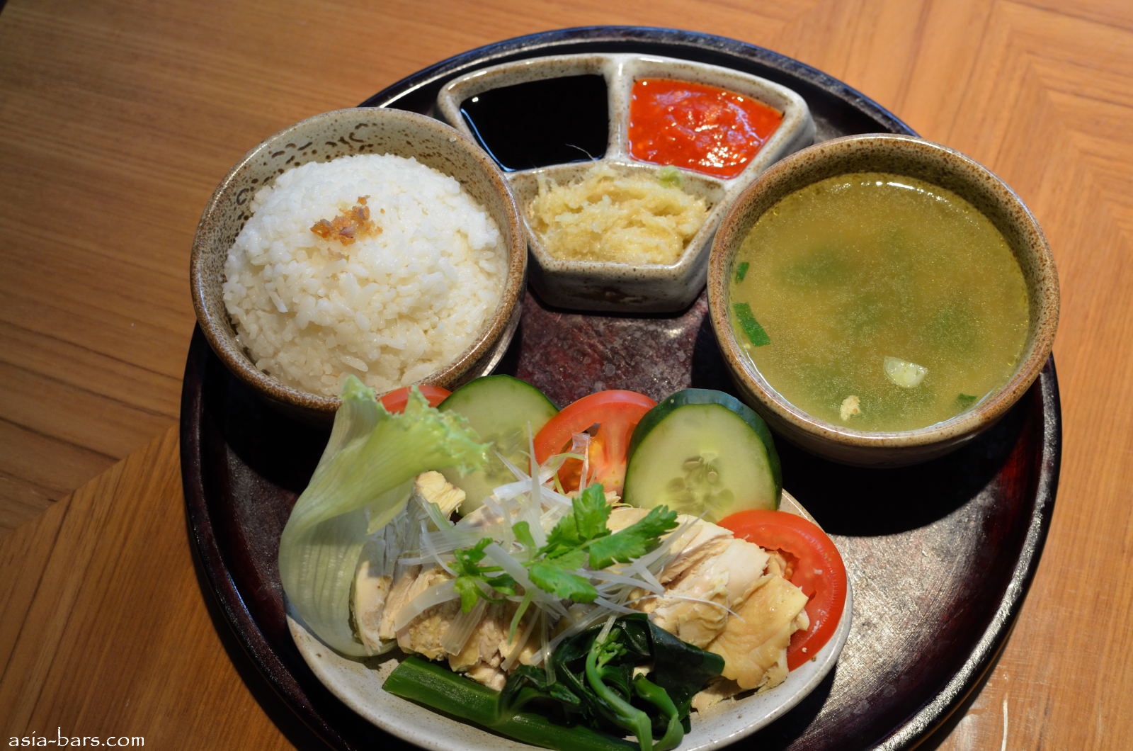 HAINANESE CHICKEN RICE– tender poached farm chicken, green vegetables, with shallot fragrant rice – served with Chinese herbs broth and traditional condiments ginger, chili sauce and dark soy sauce