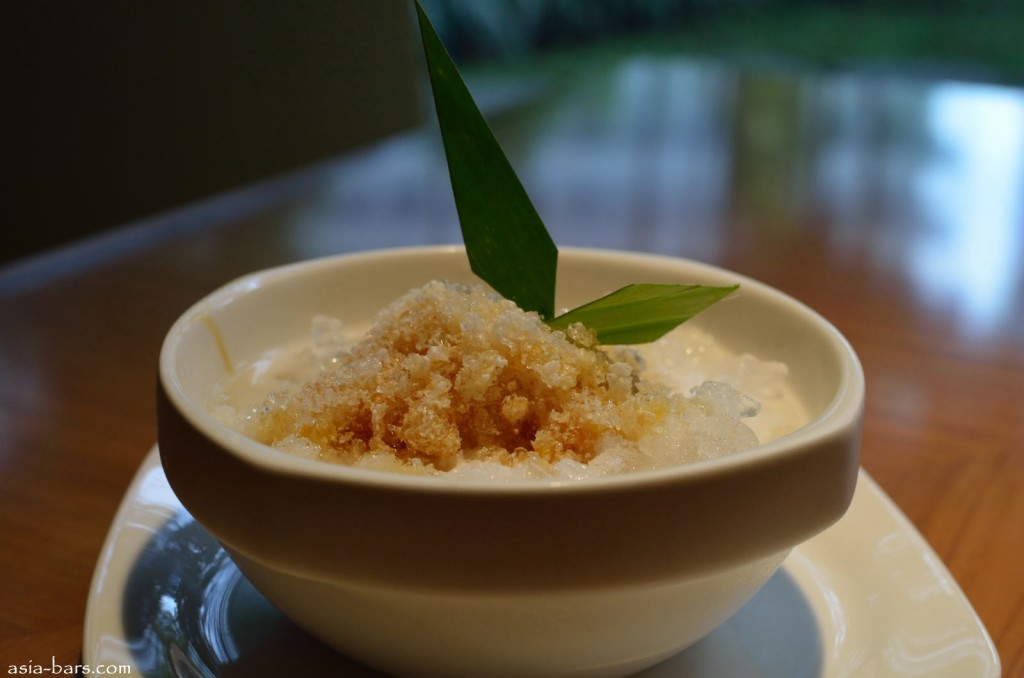 ES KACANG– shaved ice mound filled with red bean jelly and palm sugar topped with coconut syrup and milk
