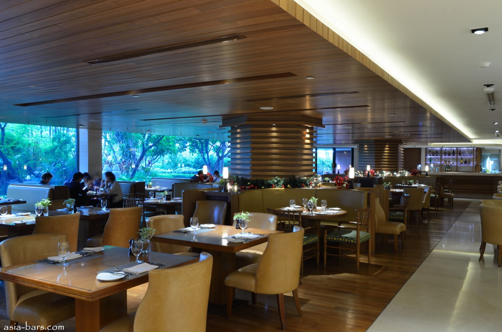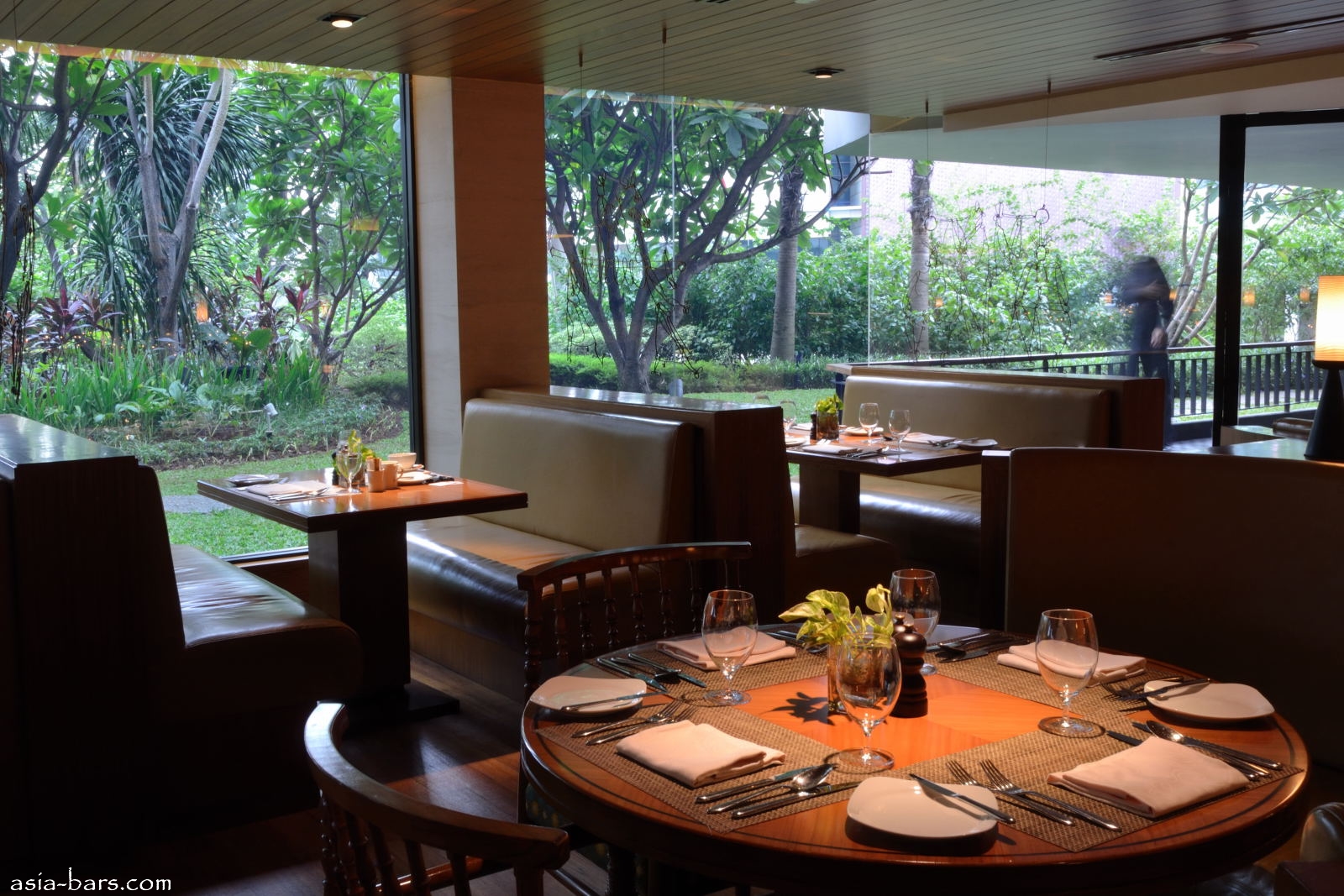 Leather upholstered booths overlooking the external garden