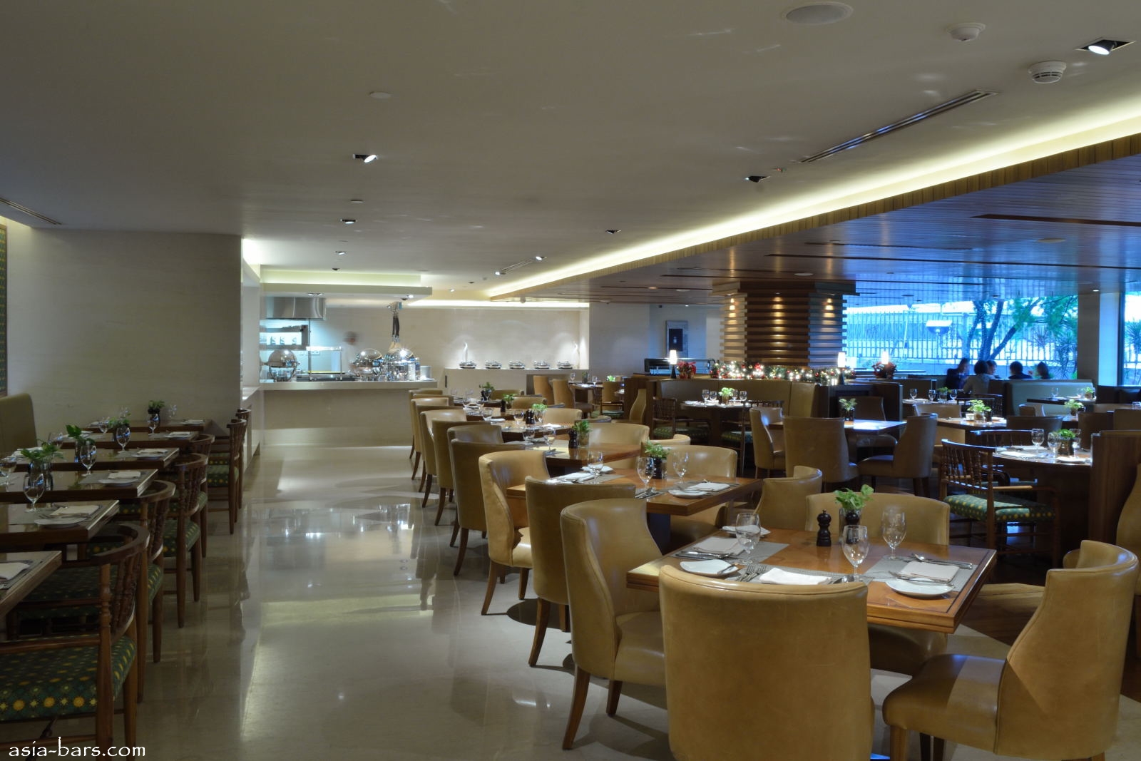The interior theme for Cinnamon is infused with the heritage of Indonesian design, and blends with a sleek, contemporary style, to create an effect that is discretely luxurious. Natural materials provide a palette of colours exuding warmth and comfort. Raw and polished timbers are used extensively on the floors, walls, and ceilings. Large areas of marble flooring in the high traffic zones abut the timber floorboards of the central dining section. The show kitchens are completely faced in marble and gleaming stainless steel, creating a simplicity of clean lines and minimal detailing. Table furnishings feature warm timbers with leather and fabric upholstered chairs, and with a series of leather booths placed along the glass windows providing intimate private dining spaces.