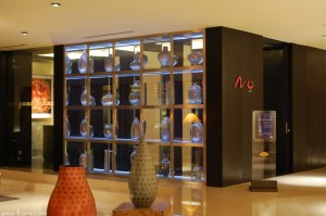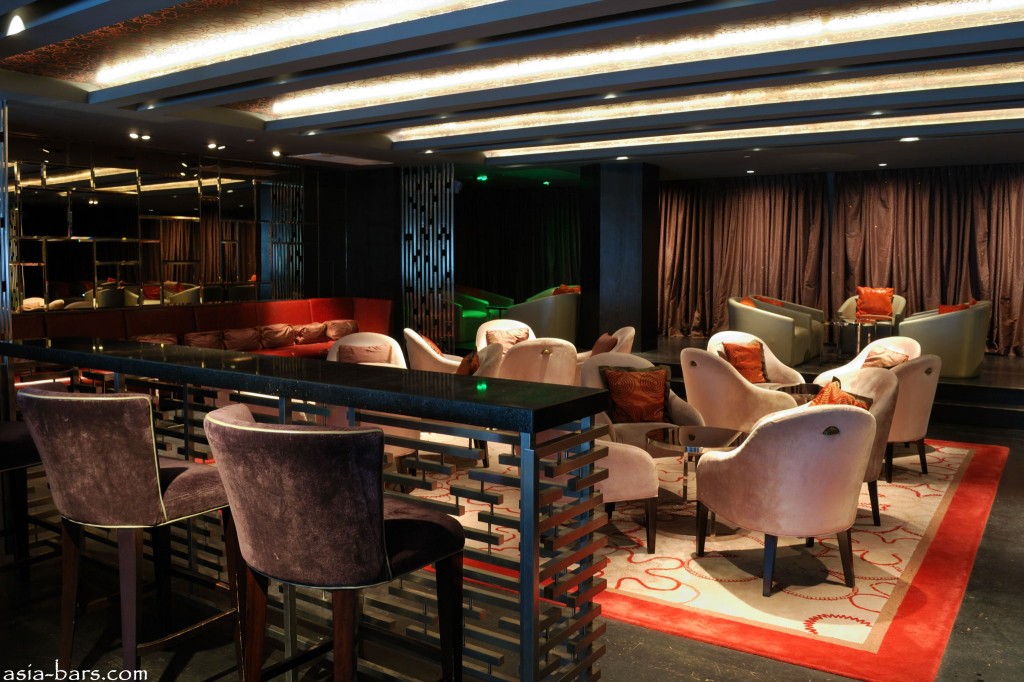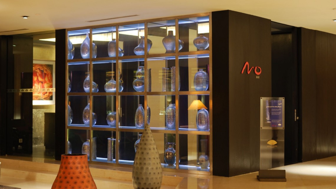 The interior of MO Bar has three main spaces- the main bar counter area in the centre of the room, a lounge area adjacent to the entrance, and behind sliding glass doors, a private room for small gatherings and meetings. The main bar counter has a “U” shape and features a black granite top, with plushly upholstered bar stools along the three sides. Additional seating is at high tables and a small bar counter overlooking the lounge area. The lounge area has luxurious armchair and sofa seating with subdued lighting making the atmosphere discrete and relaxing.