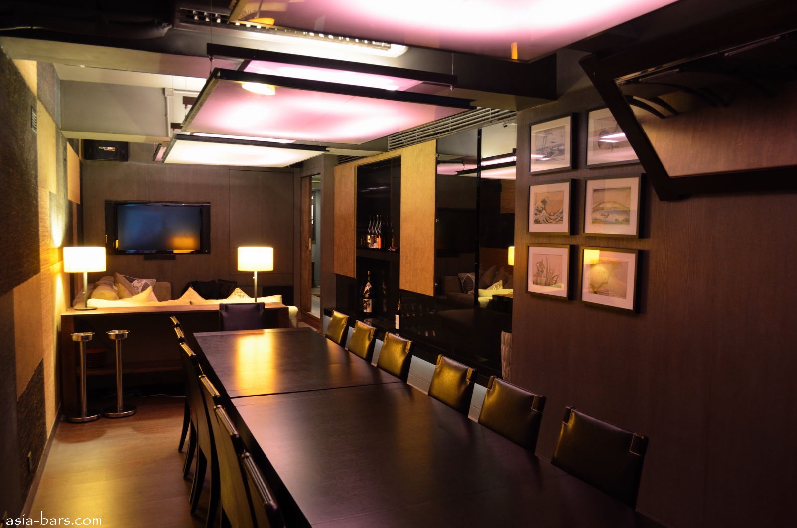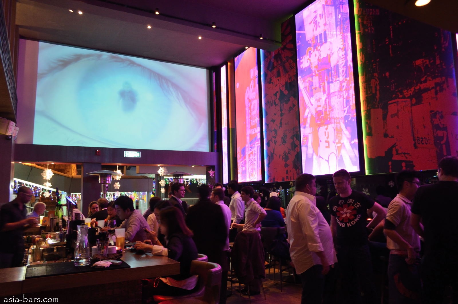 The bar area with large wall-mounted and illuminated Japanese urban scenes