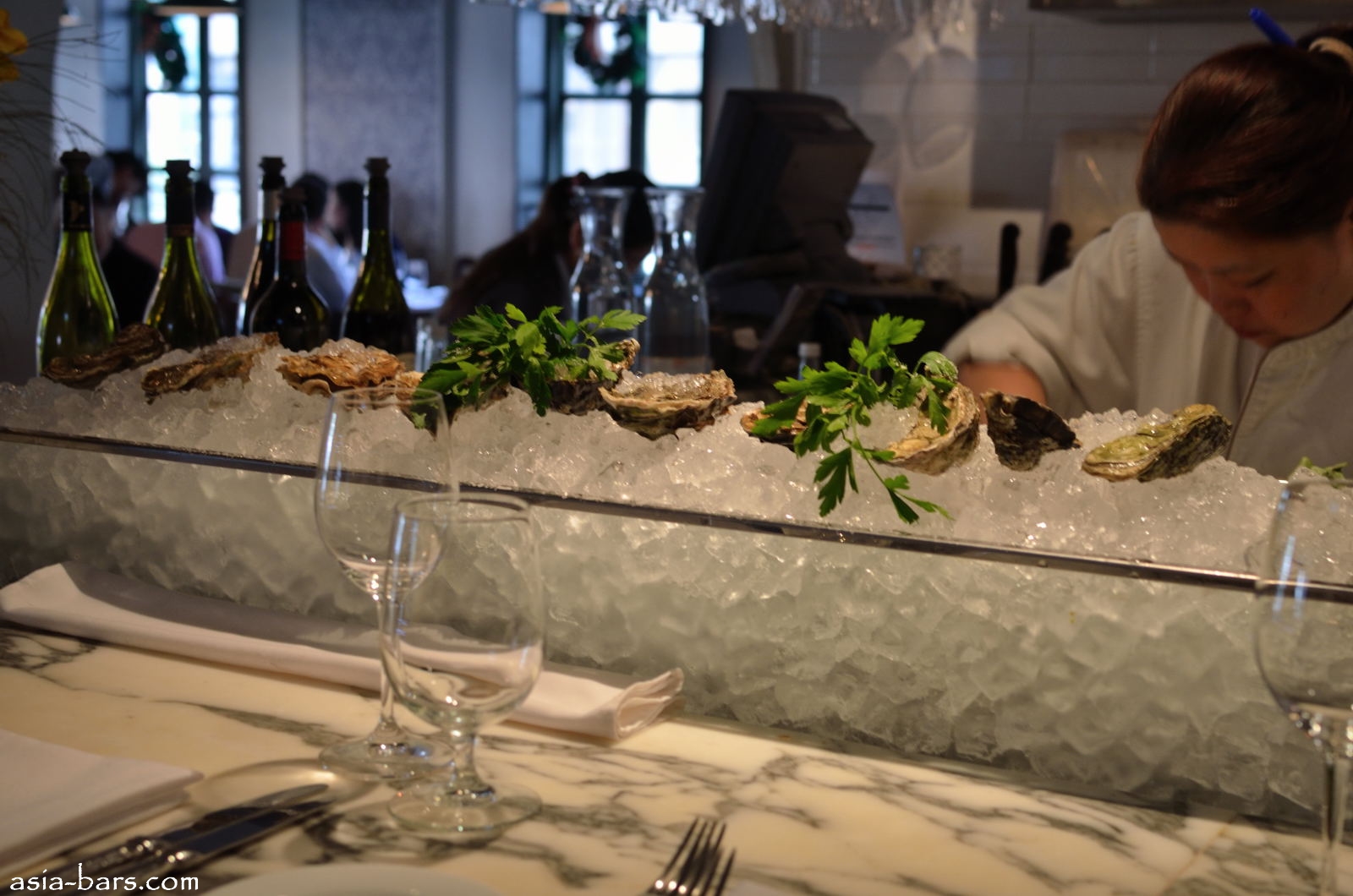 The concept behind The Pawn was to invoke an experience of entering a house, progressing first from the street level via the narrow, curving terrazzo staircase to the casual refinement of the first floor Living Room, with its leather Chesterfield sofas, vintage timber chairs and tables providing the setting for drinks, snacks and social engagement. Moving up to the next floor- the Dining Room– the guest finds  a series of  elegant dining spaces- with vintage timber tables and chairs,  white table clothes and classy table settings.  Large framed panels of a local artist’s modern interpretation of Cantonese calligraphy hang on the walls. Other features include the intimate, white marble topped oyster counter, and the open kitchen. Finally, moving up to the rooftop level, the Roof Garden is an open-air space, designed for casual after-dinner drinks- the retro theme continued with reclaimed raw timber panelling on walls, verdant greenery, and vintage style timber and wrought iron chairs and table settings to take in the fantastic night views over the lights of Wanchai.