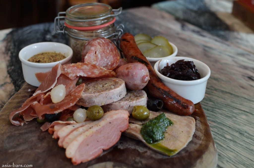 French Charcuterie Platter– chargrilled Toulouse sausage, chargrilled Merguez sausage, Paté de Campagne, Duck Rillettes, Bayonne ham, Saucisson de Lyon, Smoked Duck Magret, & Ox tongue with salsa verde. Served with pickles, olives & onion confit.