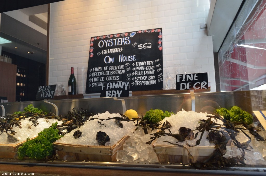 Daily selections of fresh oysters are displayed on ice at the entrance