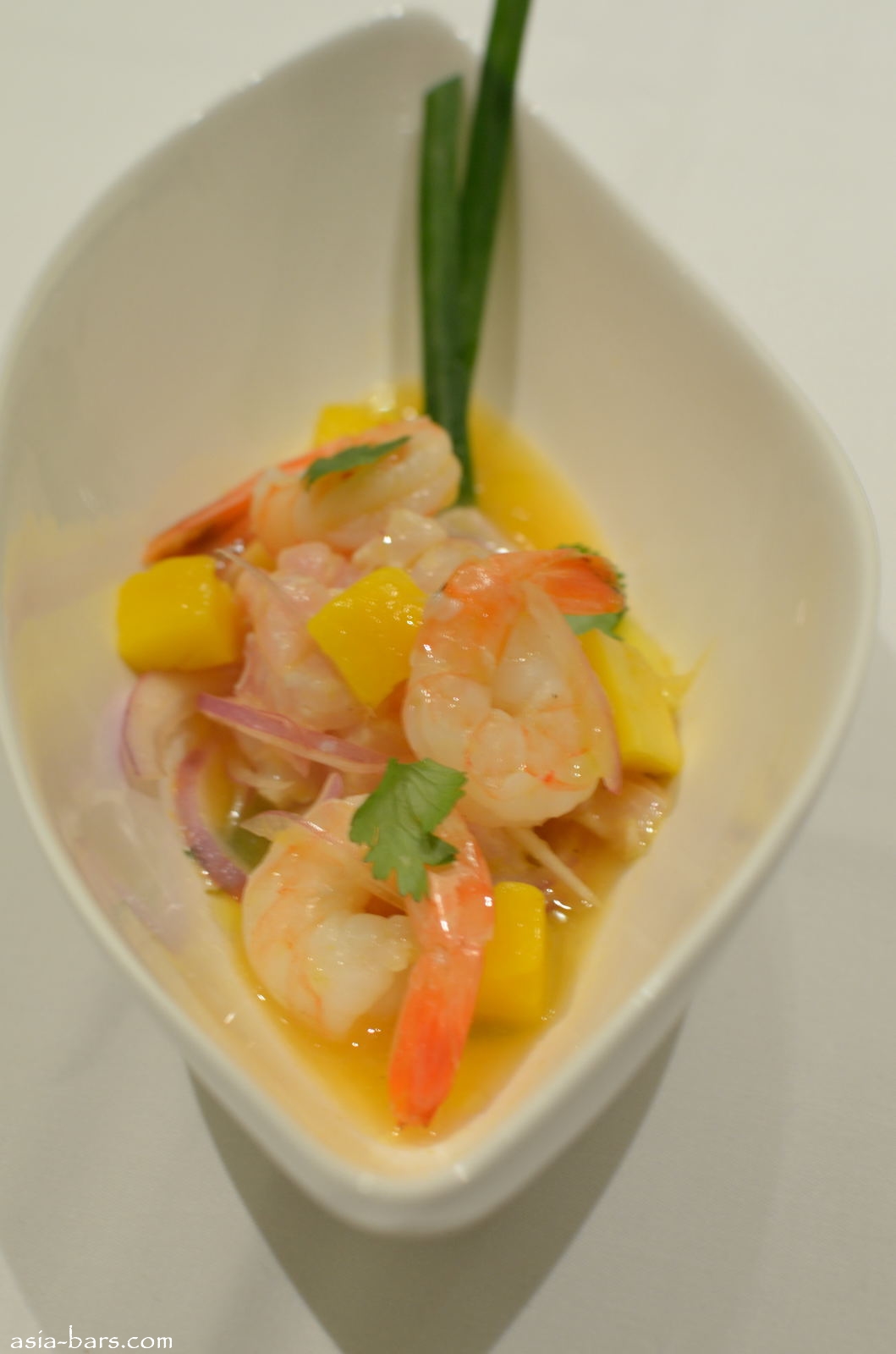 Ceviches (South American dish with raw fish tossed with citrus juice, hers and onions) – Prawns, flounder, mango and smoked chilli