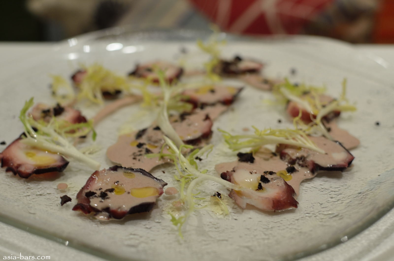 Tiraditos (Peruvian style carpaccio)– pulpo al olivo- octopus with black emulsion and coriander