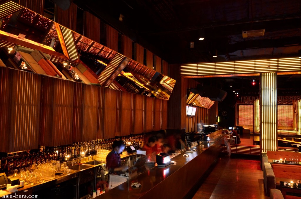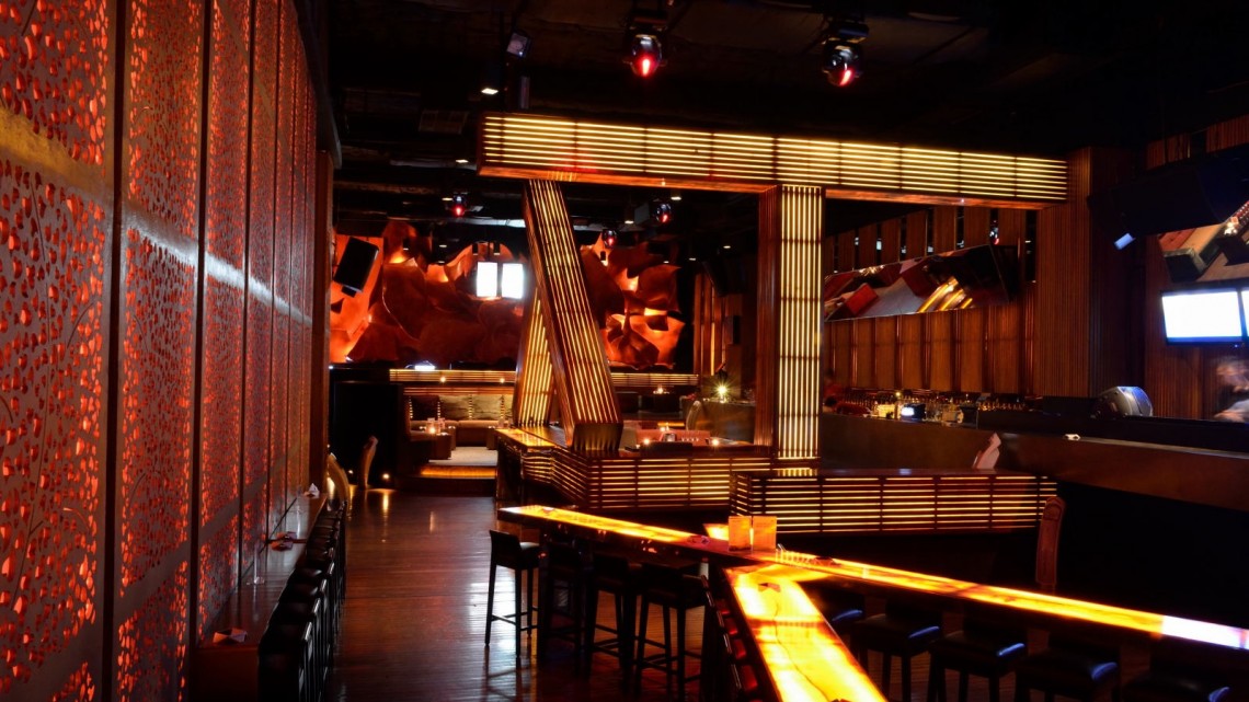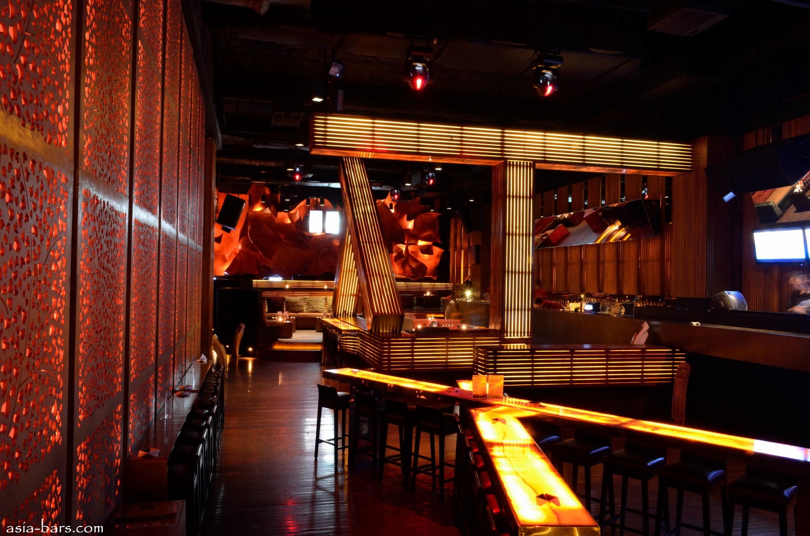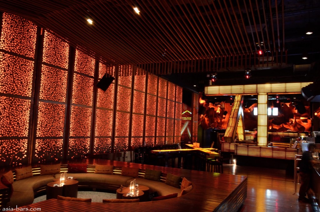 The spectacular interior of DRAGONFLY is a bold statement of contemporary Asian design, the predominating color palette and materials evoking an distinctly Asian ethos. The grandly proportioned space is entered via a long narrow passageway leading from the front reception area- creating an aura of unfolding mystery for the first time visitor. An enormous lighted timber partition panel separates the entrance from the interior, and features an intricately carved out leaf pattern that creates the impression of fluttering leaves falling from the soaring heights of the ceiling to the floor below. Dark, rich timbers are extensively used throughout the interiors- with polished timber flooring, slatted timber ceilings and huge lighted timber beams that book-end each end of the room.