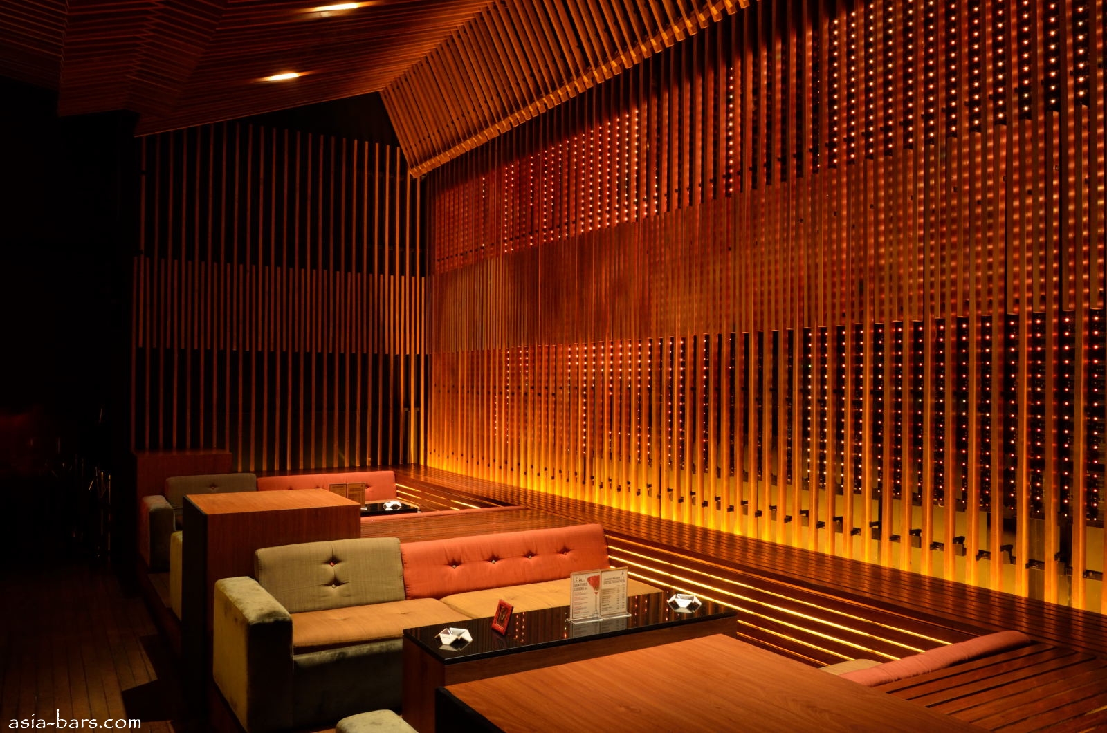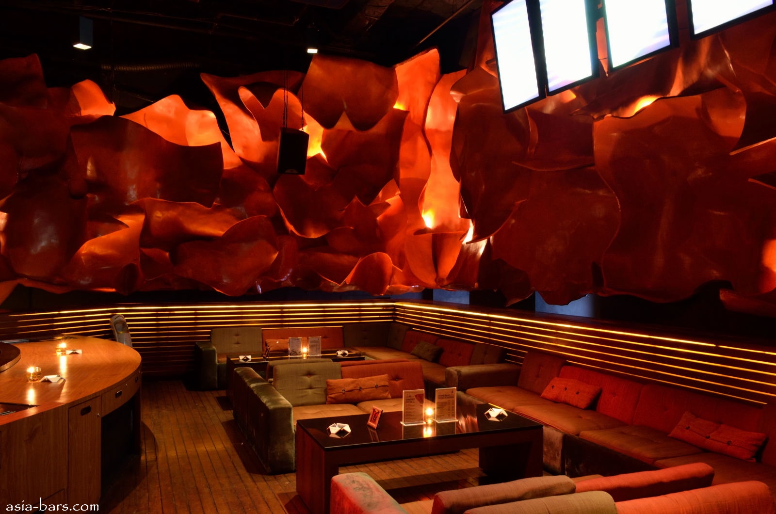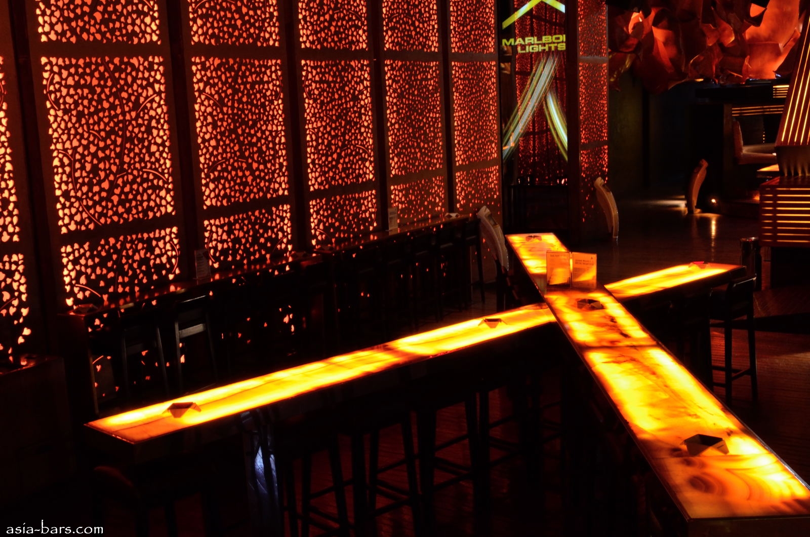 A number of spaces on different levels are seamlessly interconnected- with raised lounge seating areas at either end, and the main floor area punctuated by a large timber decked “sunken” circular lounge, and a striking high-counter table with an intersecting diagonal configuration of lighted onyx panels. The main bar extends almost the entire length of the back wall, angled mirrors placed along the wall behind the bar creates an impression of further depth to the room. At the furthest end of the room, dramatic flame red sculptured free-form shapes represent the warmth of a fire. The distinctly original design concept has been exquisitely executed, with impressive craftmanship and impeccable attention to detail.