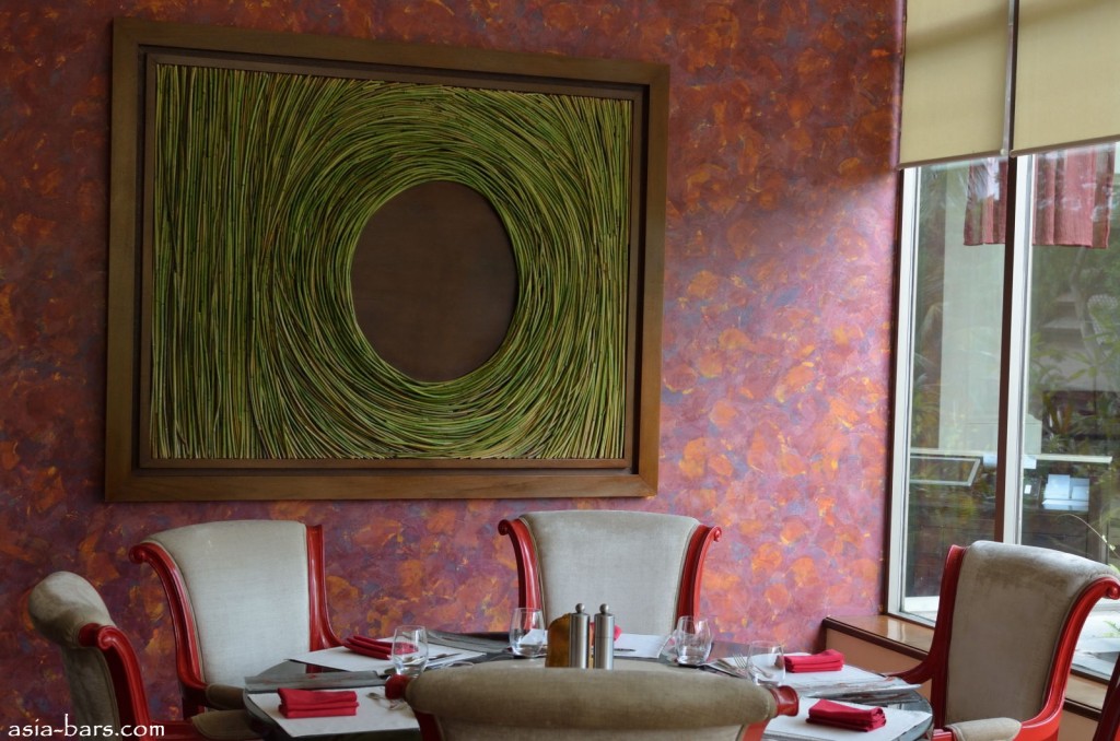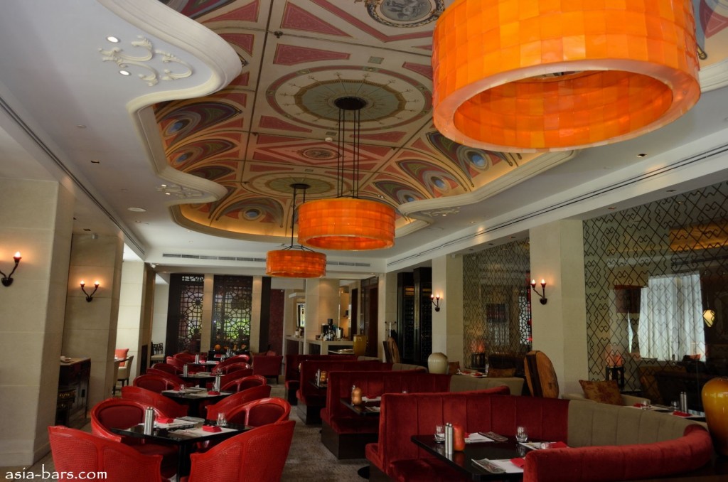The entrance to Rosso is located at the lobby level of the Shangri La. Directly beyond the restaurant reception, on a slightly raised section, is the Lounge, with the main dining room adjacent, discretely separated by decorative patterned metal screen panels. The dining room is a long narrow space- with one row of black enamel tables matched with vibrant red (synonymous with Rosso) colored chairs, and running parallel, a row of curved, plush dining booths. Overhead, the ceiling has a recessed domed shape and features a striking fresco style decoration. Suspended from the ceiling three large circular light fittings with translucent “tiled” construction juxtapose their modernity with the Renaissance era style of the ceiling fresco.