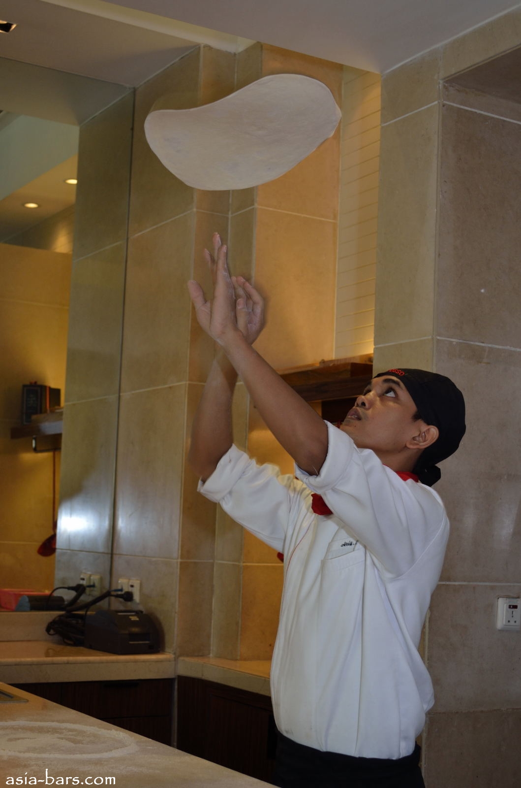 Further inside the main dining room, behind carved timber screens is a private dining room- which overlooks the counters of the Finishing Kitchen and pizza preparation area. Extending out from the main dining room is a further “L” shaped section of tables on polished timber flooring, with full height windows overlooking the hotel gardens. Abutting this section is a separate glass encased room that showcases the Antipasti Buffet.
