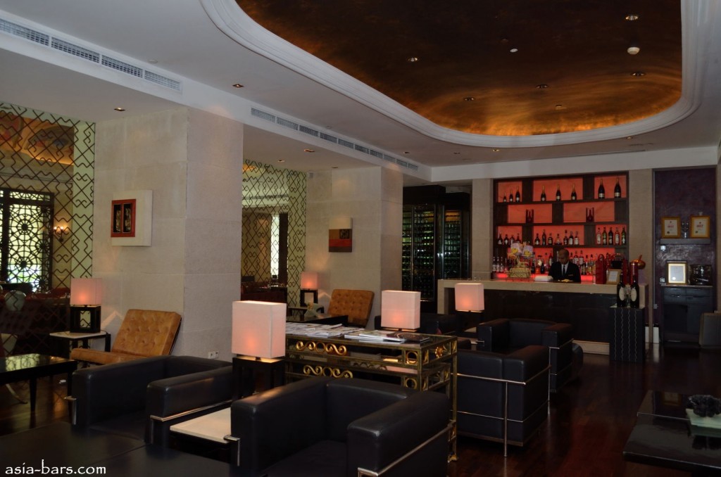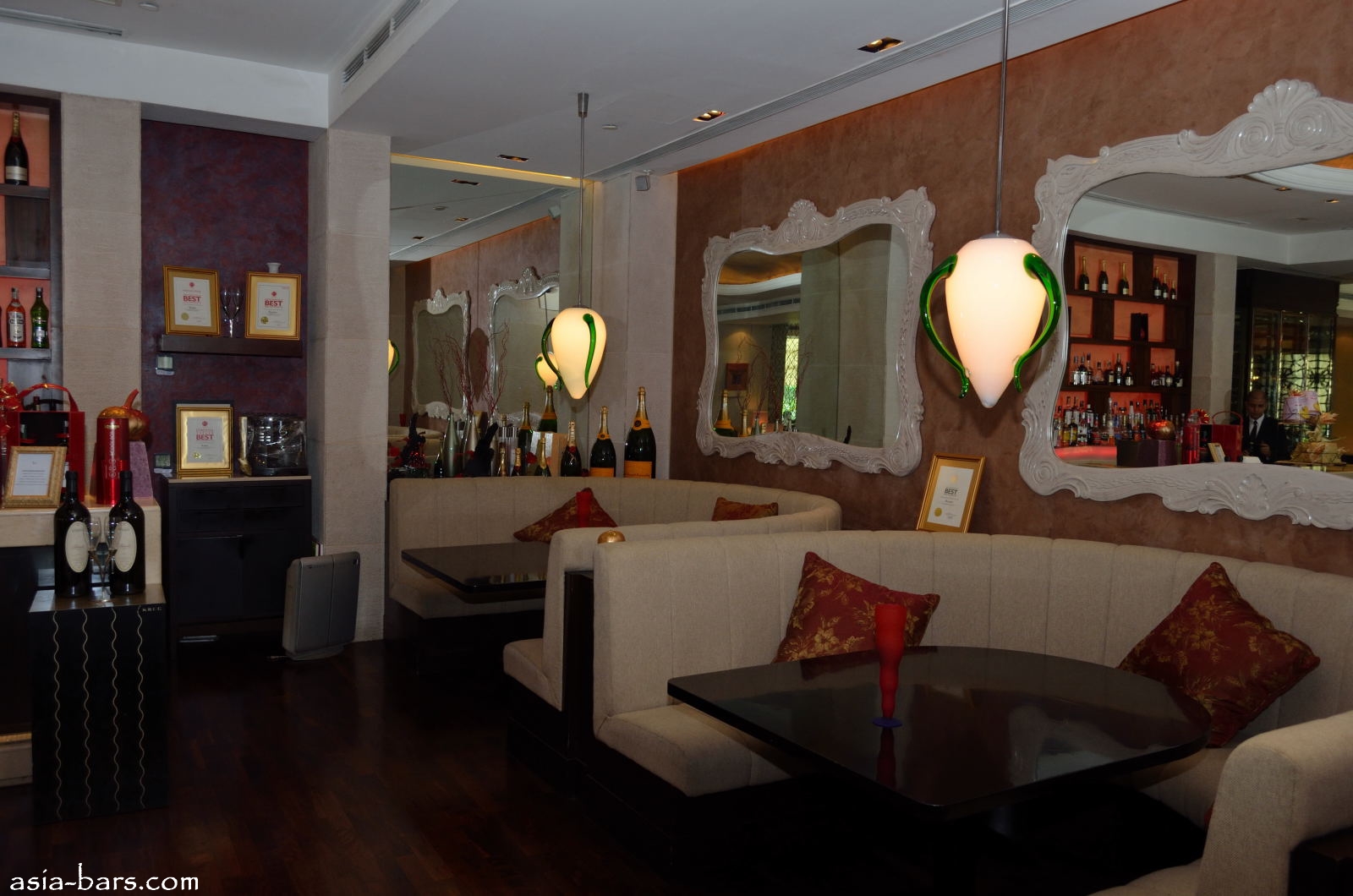 The Lounge area of Rosso- the large wine selection is housed in the see-through glass cellar adjacent to the bar