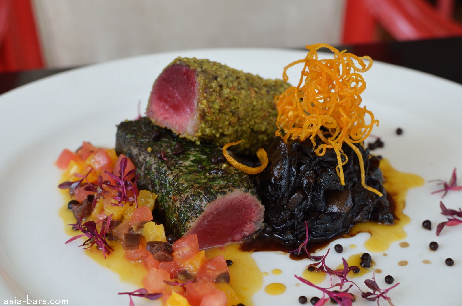 Fish & Meat dishes include- Grilled king prawns wrapped with prosciutto, served with citrus salad and Tuscan olive oil; Tagliata grilled Australian wagyu beef sirloin marble 9+ 280gr with radicchio, endive, arugula and roasted potatoes; and Crispy suckling pig “rustico” with roasted potatoes and a garlic-rosemary sauce.