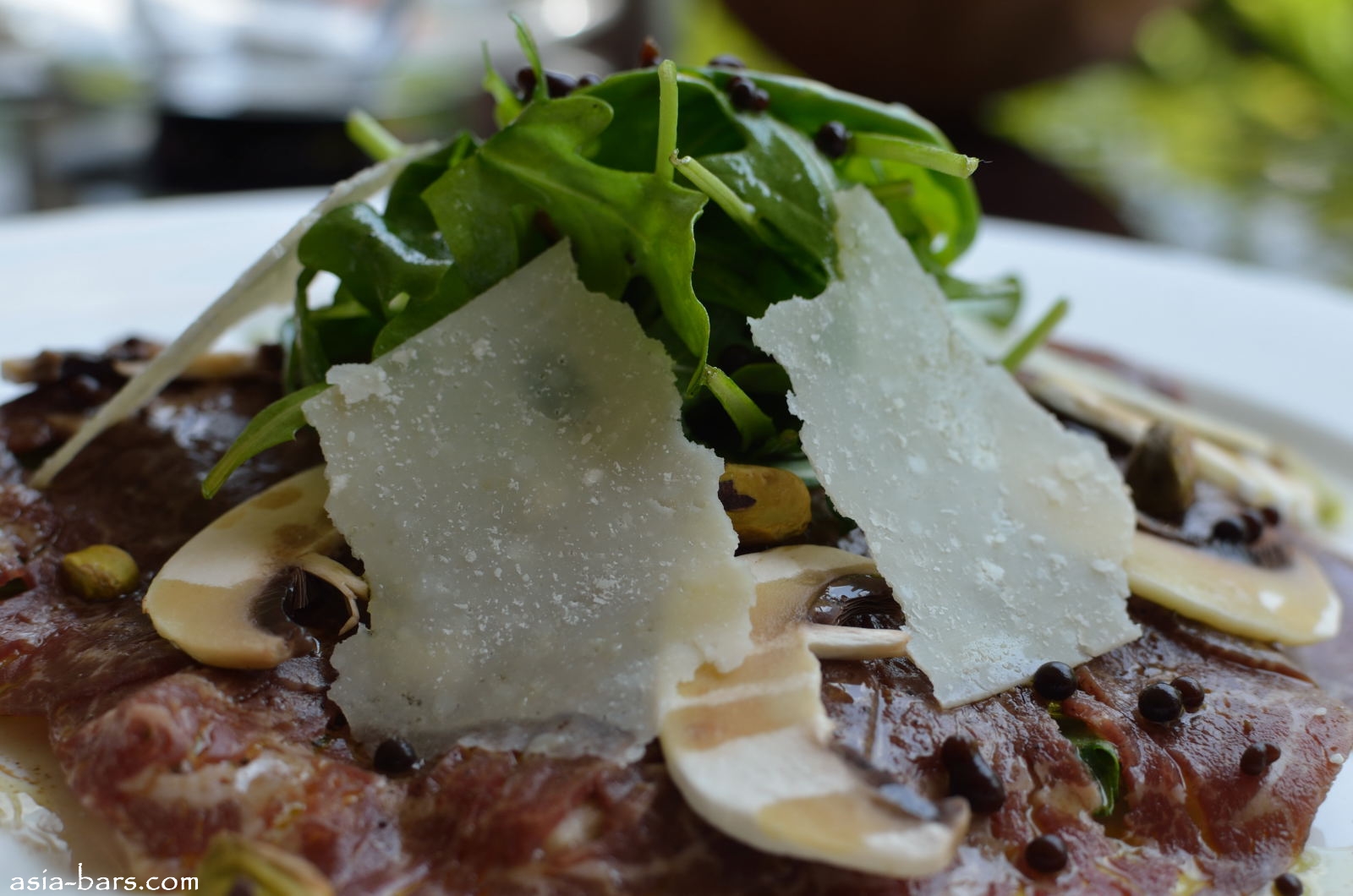 Crudo of Beef Tenderloin– with arugula leaves, parmigiano shavings, wild mushrooms & balsamic caviar