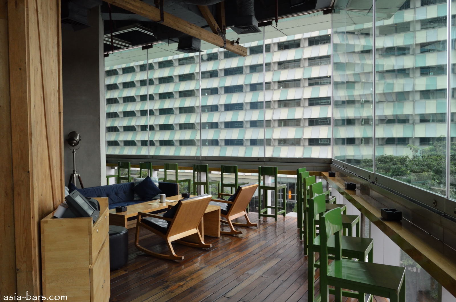 The lounge area is located along the sides of the space that face out onto the external streetscape. During the daytime large windows on the front corner section of the lounge area remain closed to provide air-conditioned relief from the tropical heat, but fold back in the evenings to open up the interiors to the cooling evening breezes. Counter seating along the two sides of the facade provide panoramic views of the Hotel Indonesia roundabout and Jakarta skyline. The long bar has an “L” shape and faces a large communal table along one side, and with another long high table/ counter extending towards the lounge area.