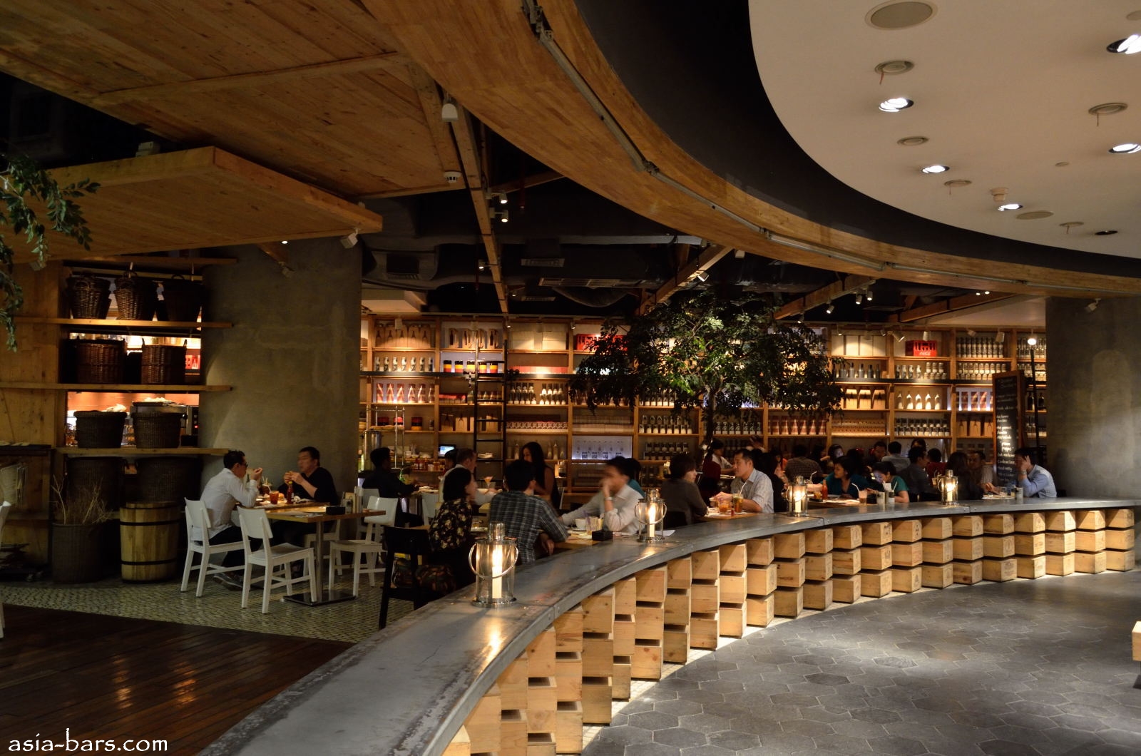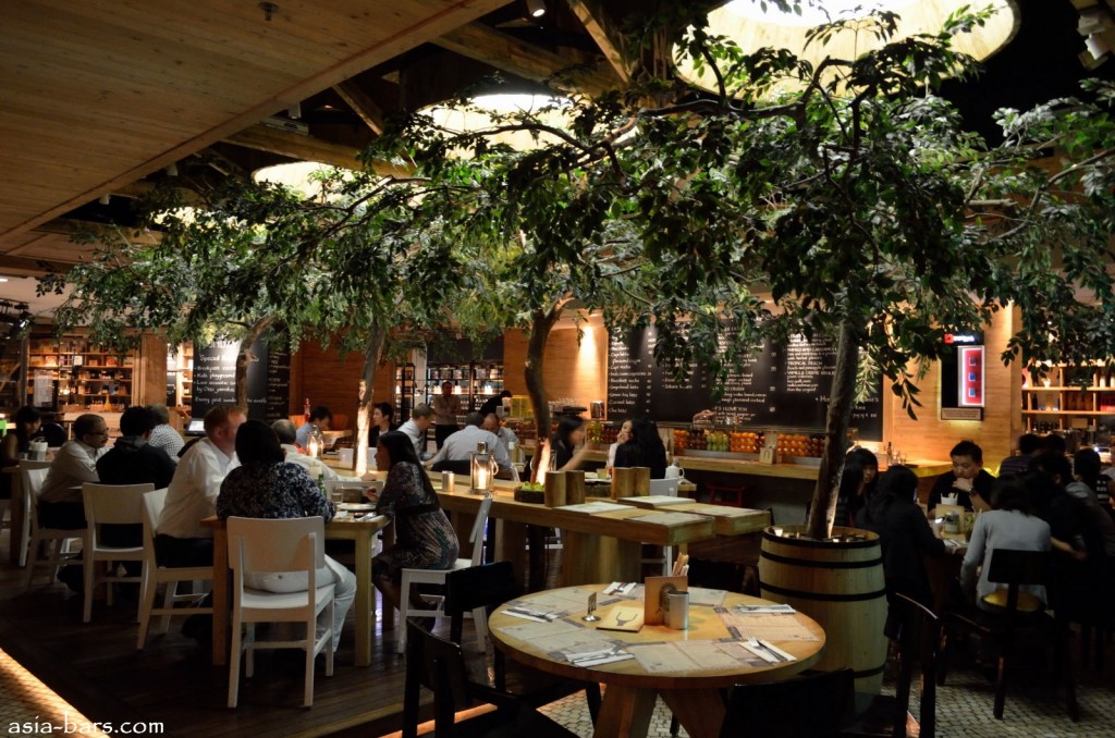 Two entrances serve SOCIAL HOUSE- one is a via a small street level lobby with a dedicated lift that delivers guests to an entrance within a re-furbished, bright red, shipping container. Access internally from the 1st floor of Grand Indonesia mall brings guests past the open shelving displays of the WinePost to a reception counter fashioned from re-cycled timber packing crates.