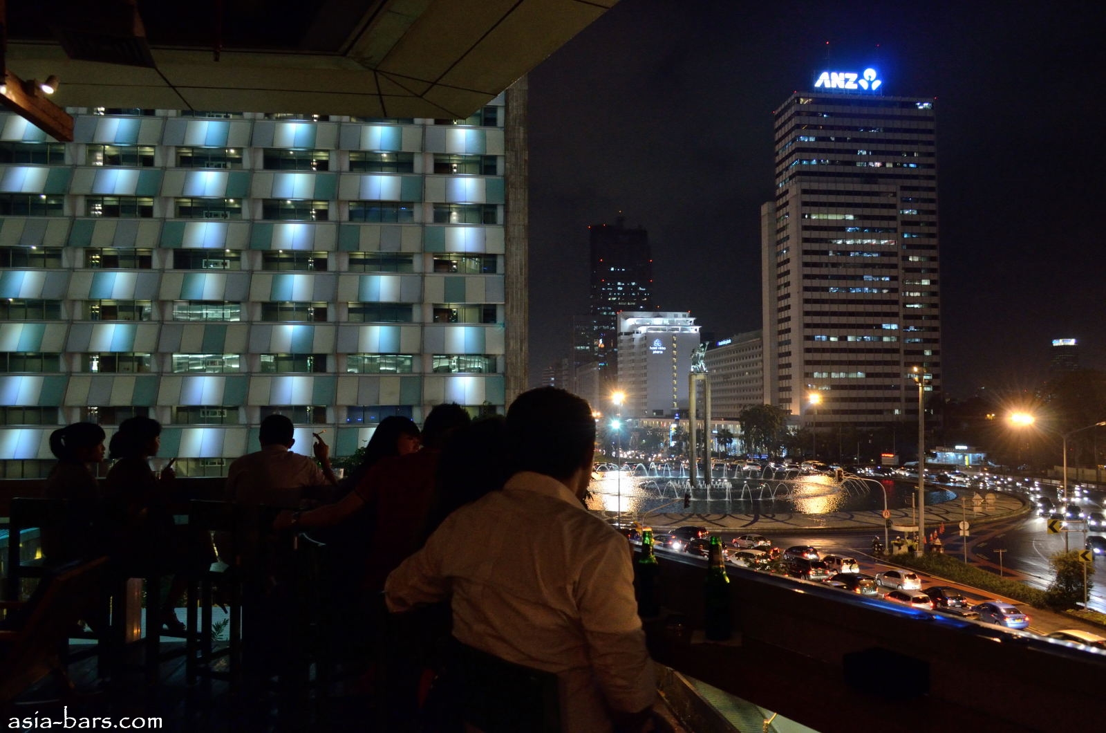 The lounge area with the large glass panes folded back and open views over the iconic Hotel Indonesia roundabout