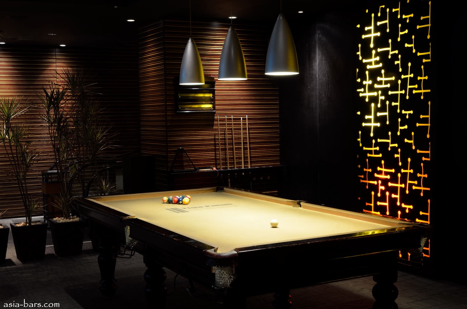The entrance to TIGA PULUH is from the hotel lobby level, down a dedicated set of escalators to the lower level room. The Lounge section is encountered first at the foot of the escalators, with a stylish interior design of muted colours, timber panelled walls and comfortable sofa seating. A large, all glass wine cellar showcases the extensive wine selection, and at one end of the Lounge, a long curved bar counter exudes a soft orange glow. Separated from the inner Music Bar by solid double doors, the Lounge is a quiet space for conversations, catching up with sports action on the large LCD screen, or maybe a game of pool.