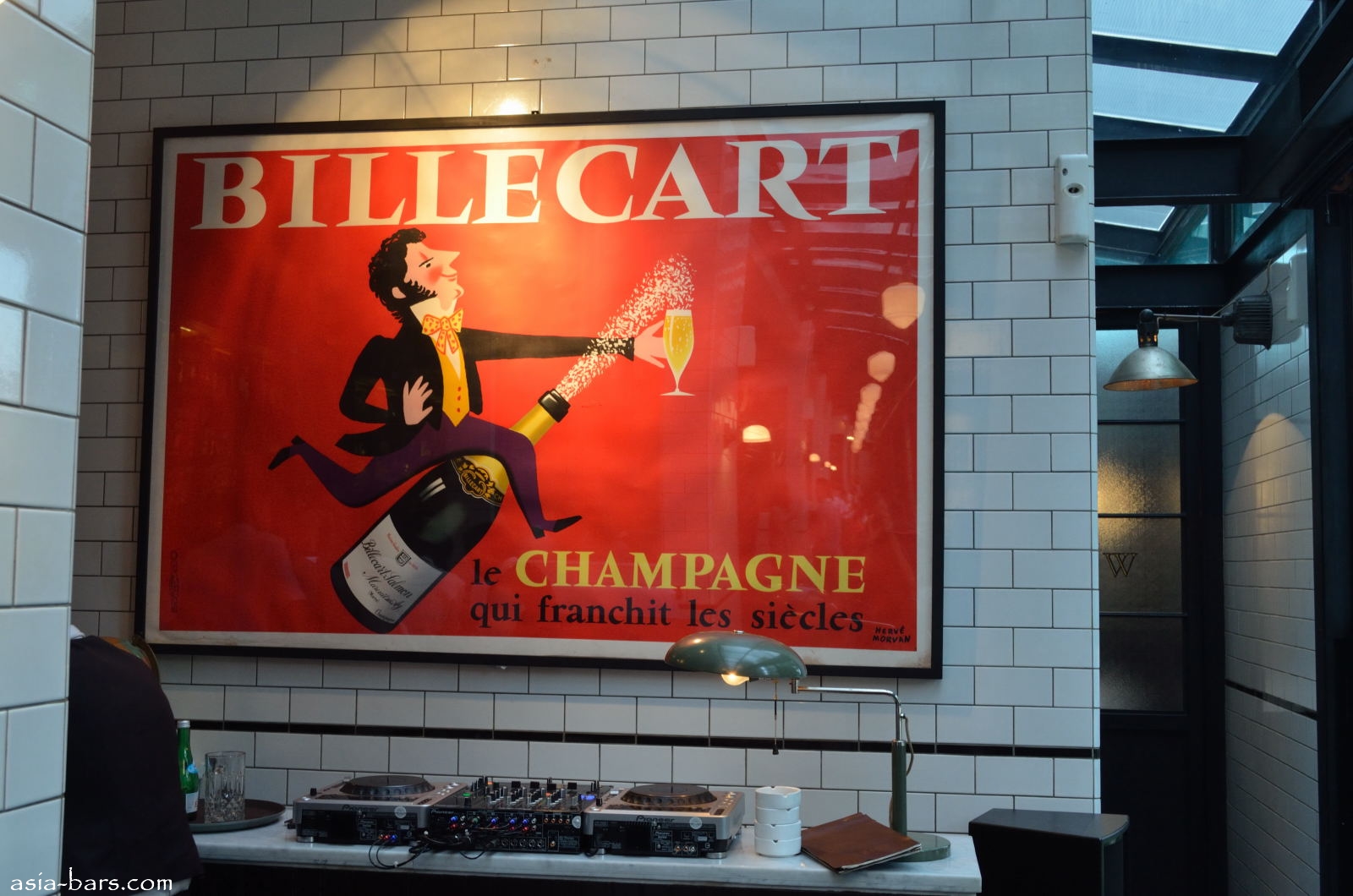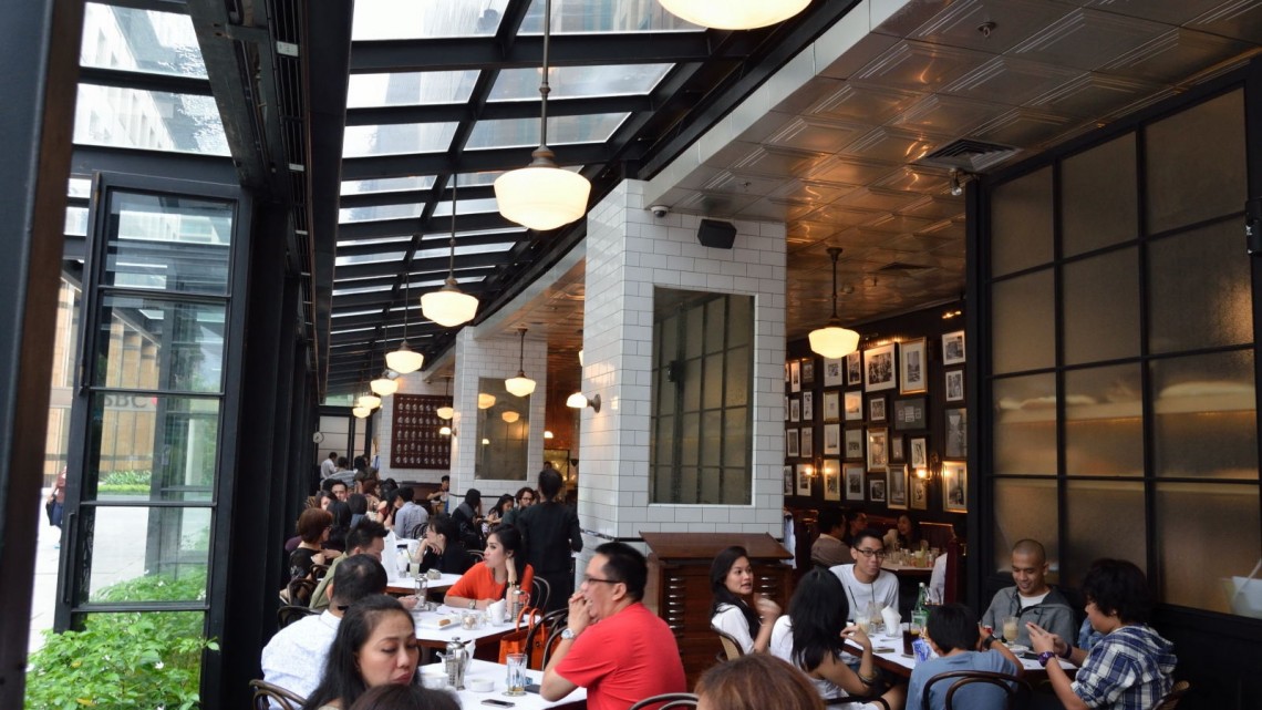 The space occupied by UNION is a long narrow section spanning along the side of the Plaza Senayan main building. With a facade of folding timber framed windows that completely open up to the outside, and a partial glass roof, the interiors are bathed in natural light during the day. The floor space divides into three sections- the main brasserie dining area, the Bakery counter has its own dedicated space and direct entrance from the mall interior, and at one end of the space, the bar -with adjacent walk-in wine cellar- and a station for the DJ turntable. The interior design draws on the style of the classic early 20th Century New York brasseries – with dark timber wall panelling, pressed metal ceilings, white tiled pillars. Furnishings feature the classic timber bistro style chairs, dark timber tables with white paper sheets, and a series of leather upholstered booths line the interior wall. Decorations include an eclectic collection of vintage fittings and pieces collected personally by the owners on their travels.