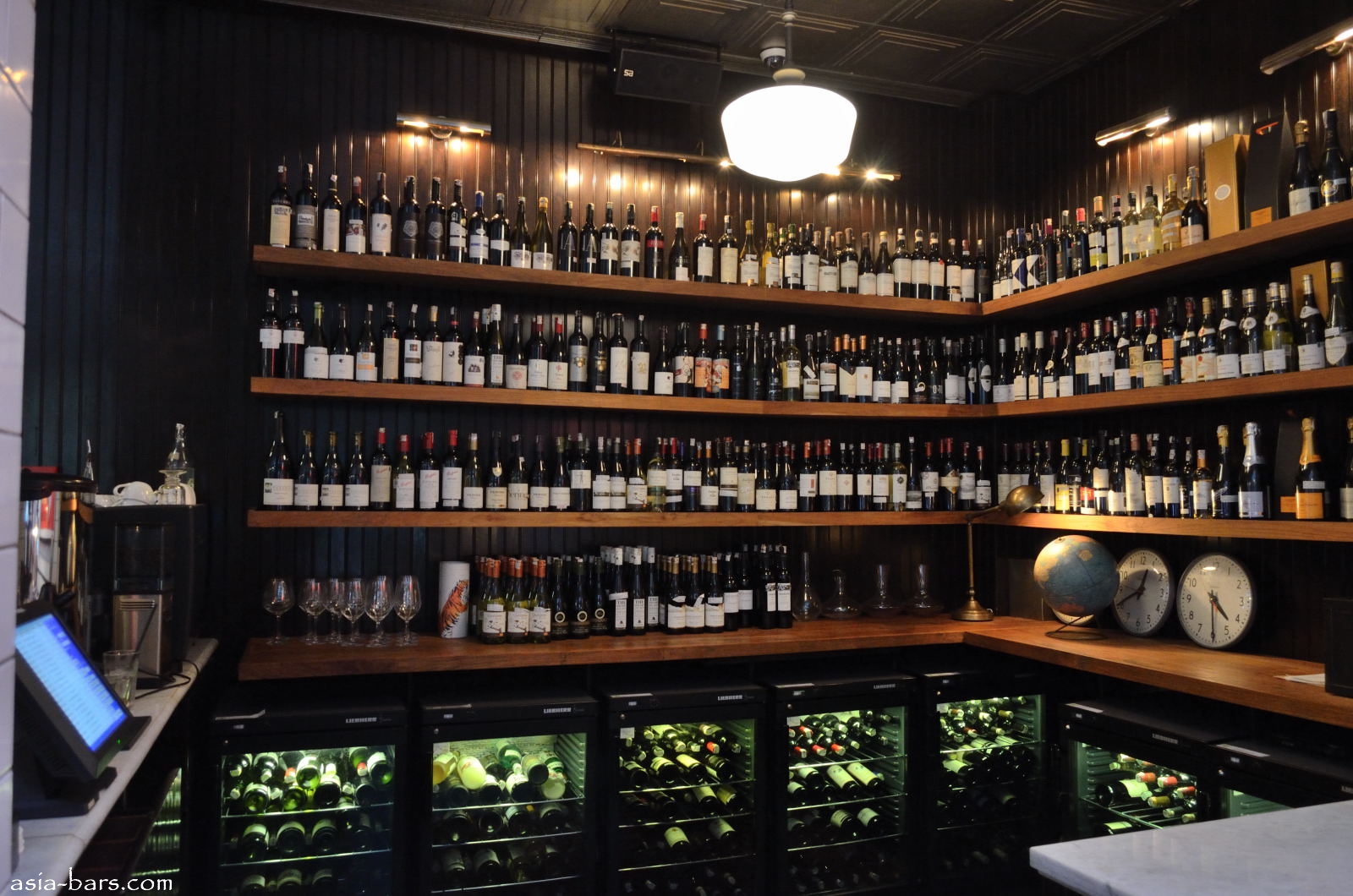 The bar decor continues the classic theme with a long white marble counter top, leather padded bar seats, and mirror-backed timber shelving to display the large range of spirits and liqueurs. Large, vintage, industrial style light fittings are suspended from the ceiling above the bar. And the impressive wine selections are showcased in a walk-in, timber panelled wine cellar directly adjacent to the bar.