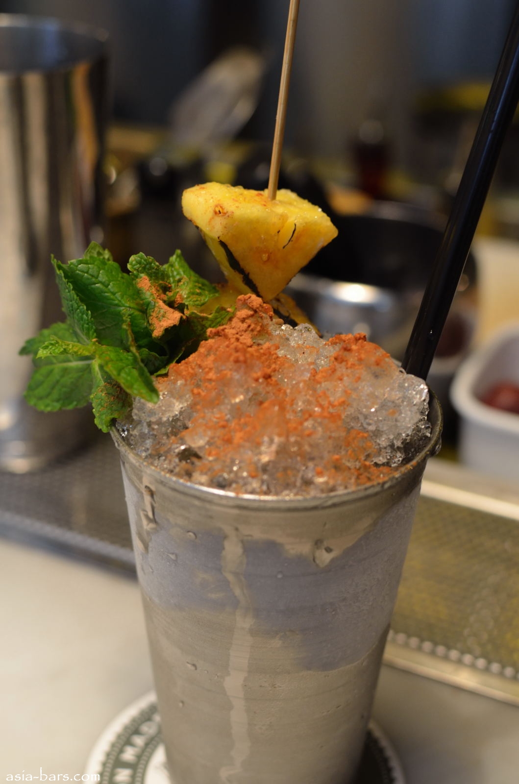 “Twisted Classic” cocktail- PINEAPPLE & CINNAMON JULEP- Pineapple infused bourbon, cinnamon syrup, char-grilled pineapple wedges & mint