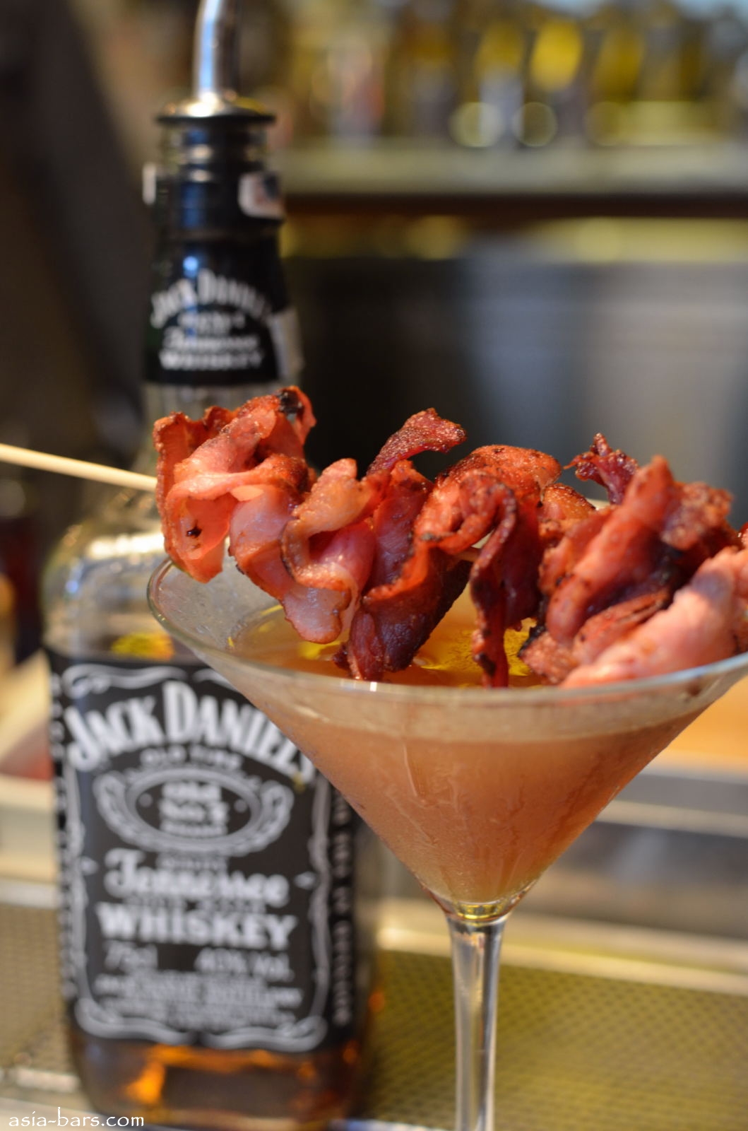 Signature cocktail- MEAT PACKING DISTRICT- fat washed bacon, Tennessee Whiskey, sweet vermouth, orange bitters, topped with crispy bacon skewer