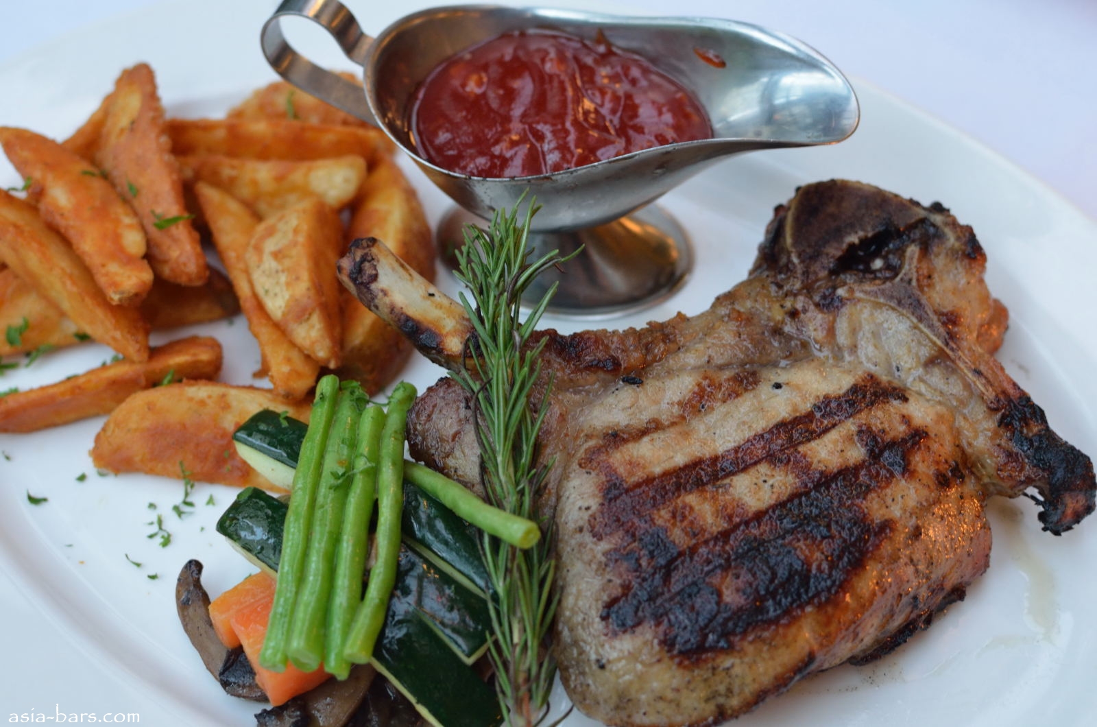 From the Grills selection- Bone-in Pork Chop– served with garden vegetables and pomme purée