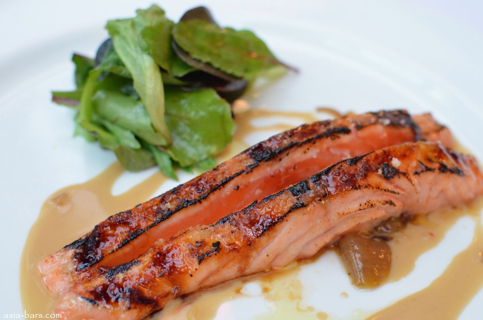 From the Starter selections- Blackened Tasmanian Salmon Belly- with truffle sesame sauce, caramelized onions