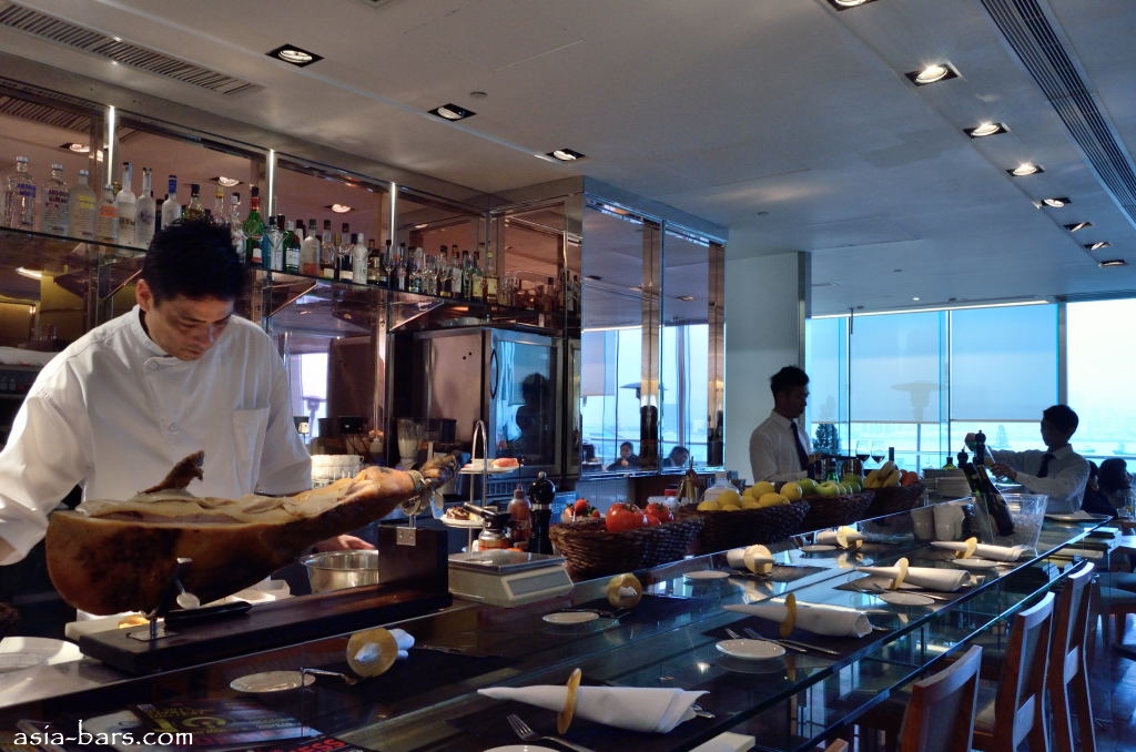The entire facade onto the outdoor terrace comprises full height glass panels, which both flood the interiors with natural light, and provide spectacular harbour views from virtually every seat inside. The covered outdoor terrace is a private space with further table seating for around 50 guests. The panoramic views from the terrace take in a broad sweep from the western reaches of Victoria Harbour, across to the Kowloon skyline, and extending back to the Wanchai waterfront.