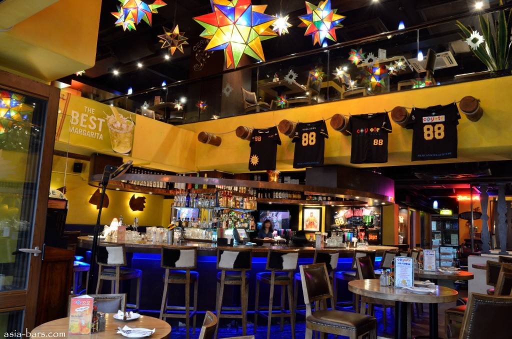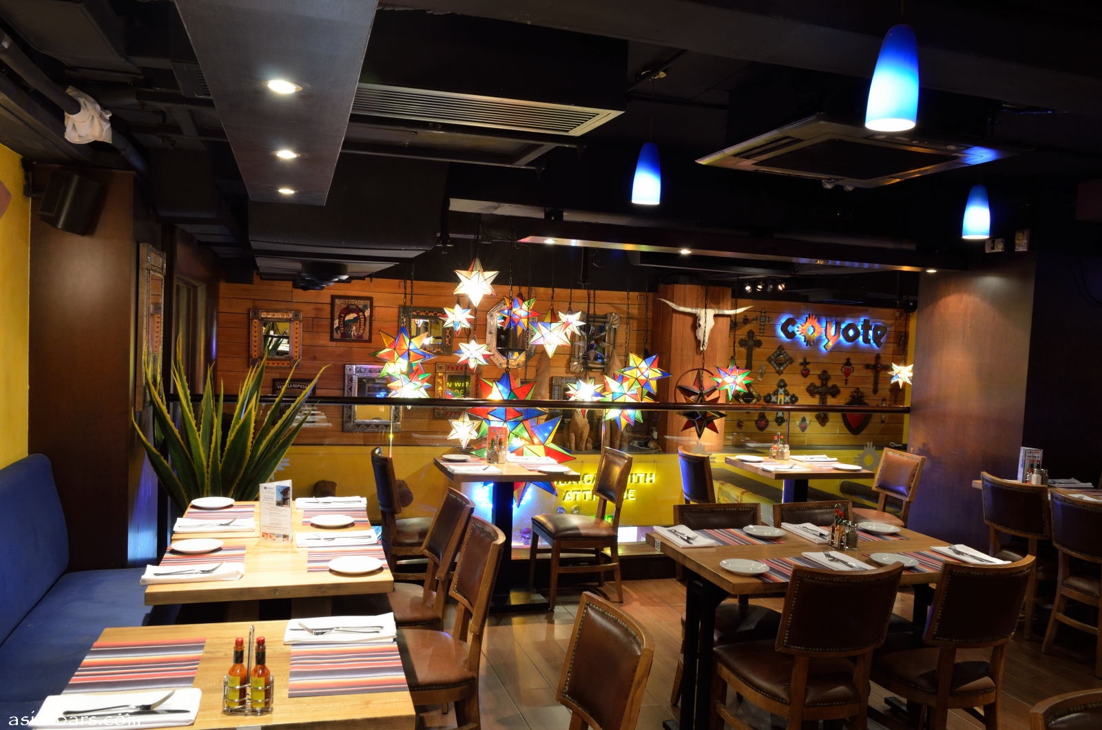 The interior design of Coyote cues from the Mexican “adobe” style- with yellow, sand-coloured washed walls and exposed log beams evoking the feel of a desert structure. Imported sandstone from the Mojave Desert is also utilised, and walls are decorated with authentic handicrafts made by North American Indians from Oaxaca, Mexico. Several signature “coyotes” feature- each carved by chainsaw in Santa Fe from solid tree trunks. Retro-style neon signs and multi-colored light fittings hanging from the ceiling, add visual highlights to the large open space. And large cacti plants complete the desert theme.