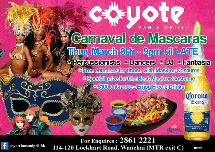 Also, during the promotional period, Coyote will be holding an additional event to celebrate on Thursday, March 8, 2012 from 9pm onwards. The Carnaval de Mascaras will provide the ultimate Brazilian experience, from percussionists, dancers, DJ’s, fantasia and more. The cover charge is HK$100 which includes two free drinks. Guests wearing a mask or costume enjoy free entry, with a special prize for the best mask or costume.