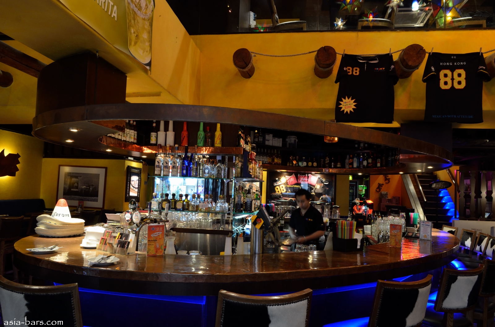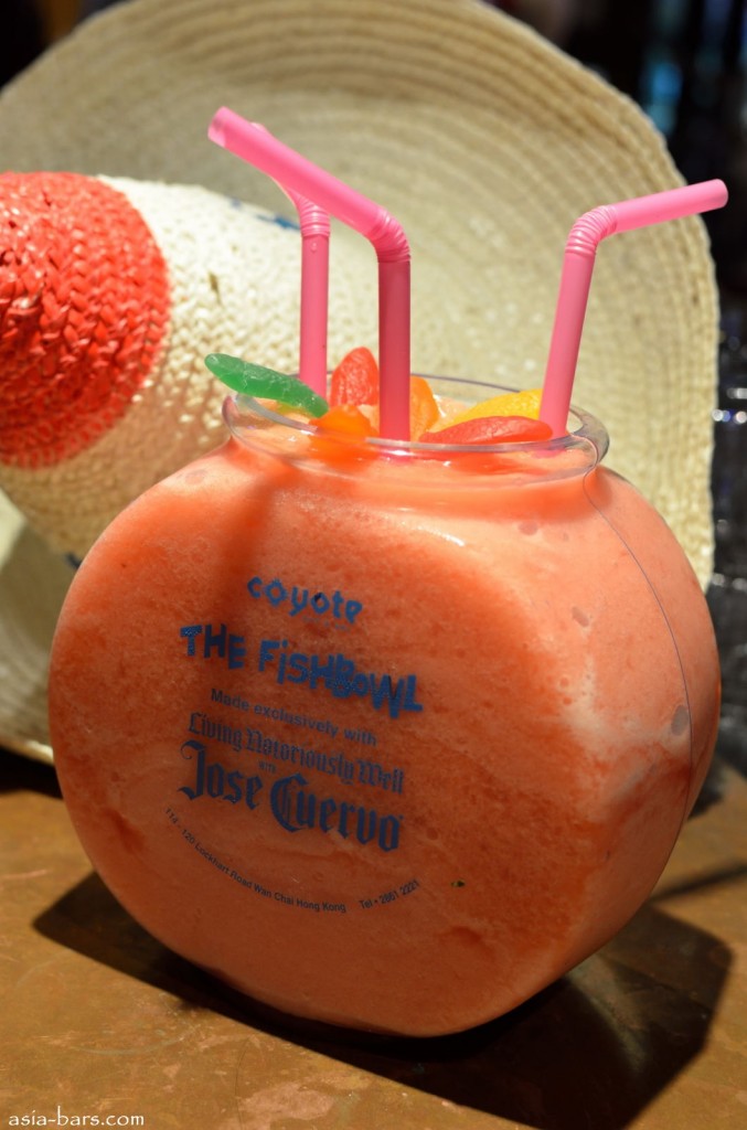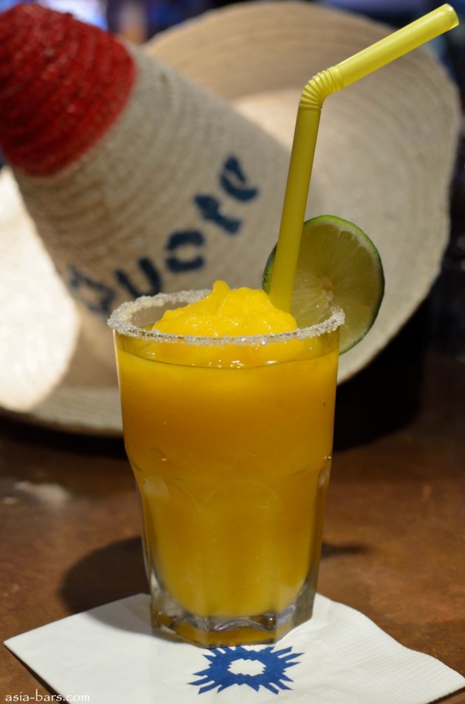As the premier margarita bar in Hong Kong, the bar menu at Coyote showcases over 70 varieties of margaritas. The selections are broken down into categories such as over 30 varieties of “Margaritas Especiales”– frozen or on the rocks (HK65 per glass); “Frozen Fruit Margaritas” with 18 varieties; and further categories- “Coyote Especial Ultimas”; “Supremas D’Oro” (HK$72 per glass) and “Las Margaritas Ultimas” (HK$98 – 158 per glass)- made from premium tequilas such as Cuervo Gold; Patron Silver & Reposado & Anejo; and Centenario. Other “signature” drinks at Coyote include their “Fishbowls” – six varieties of frozen fruit margaritas served in a 1.5 litre “fishbowl” – suggested for sharing amongst three or four friends. A full range of other cocktails, beers and wines are also available, plus “Flaming Specials” at the bar, sangria, and the “Tojitos”– mojito fruit based cocktails- spiced up with a dash of Tabasco pepper sauce.