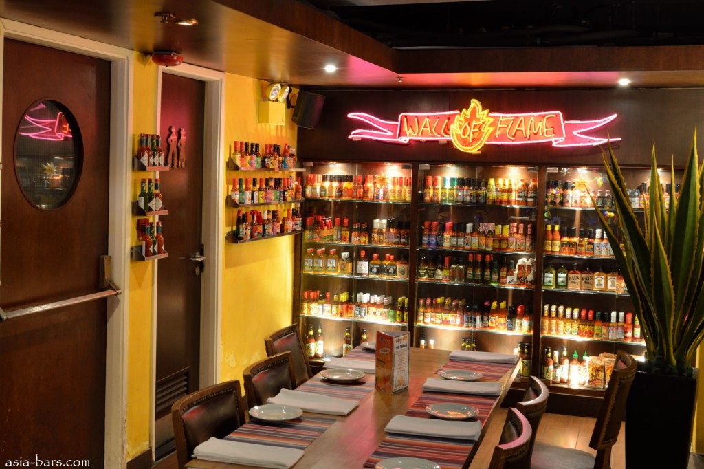 The “Wall of Flame” on the upper level dining room offers a huge selection of hot sauces