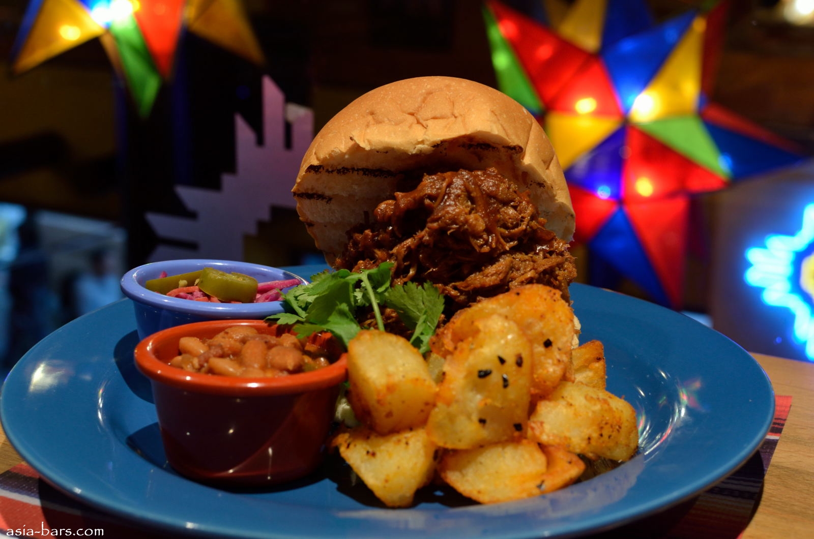 BBQ Pulled Pork Sandwich- Texas style tender smoked marinated pulled pork with Coyote barbecue sauce, stacked high on a soft bun. Served with smoky beans, ancho chili potatoes and a honey dijon slaw