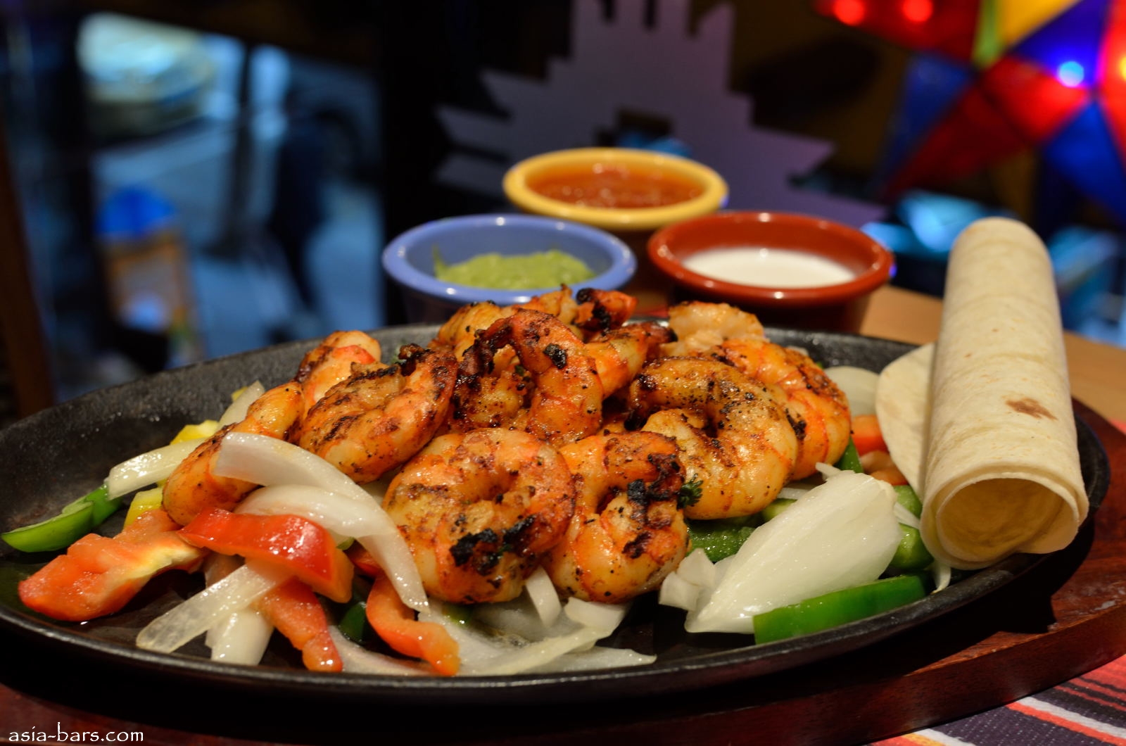 Prawns Fajita– on a sizzling hot iron skillet with fresh grilled onions and bell peppers, served with with home made fresh guacamole sauce, sour cream and red salsa, served with tortilla bread