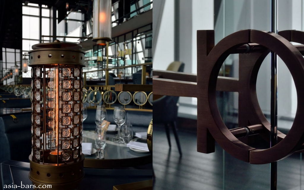 Two of the signature design details of aqua- (l) the “fresnel lens” inspired nautical brass lamps; and (r) the signature aqua motif- the “ankh” symbol- ancient Egyptian hieroglyphic representing eternal life